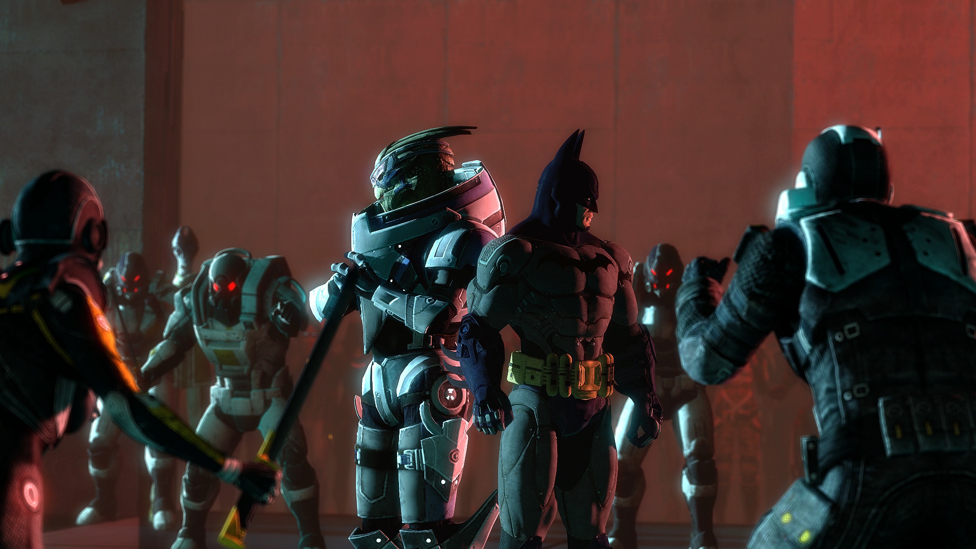Description: A group of people in costumes standing in a room with a red light behind them and a red wall.