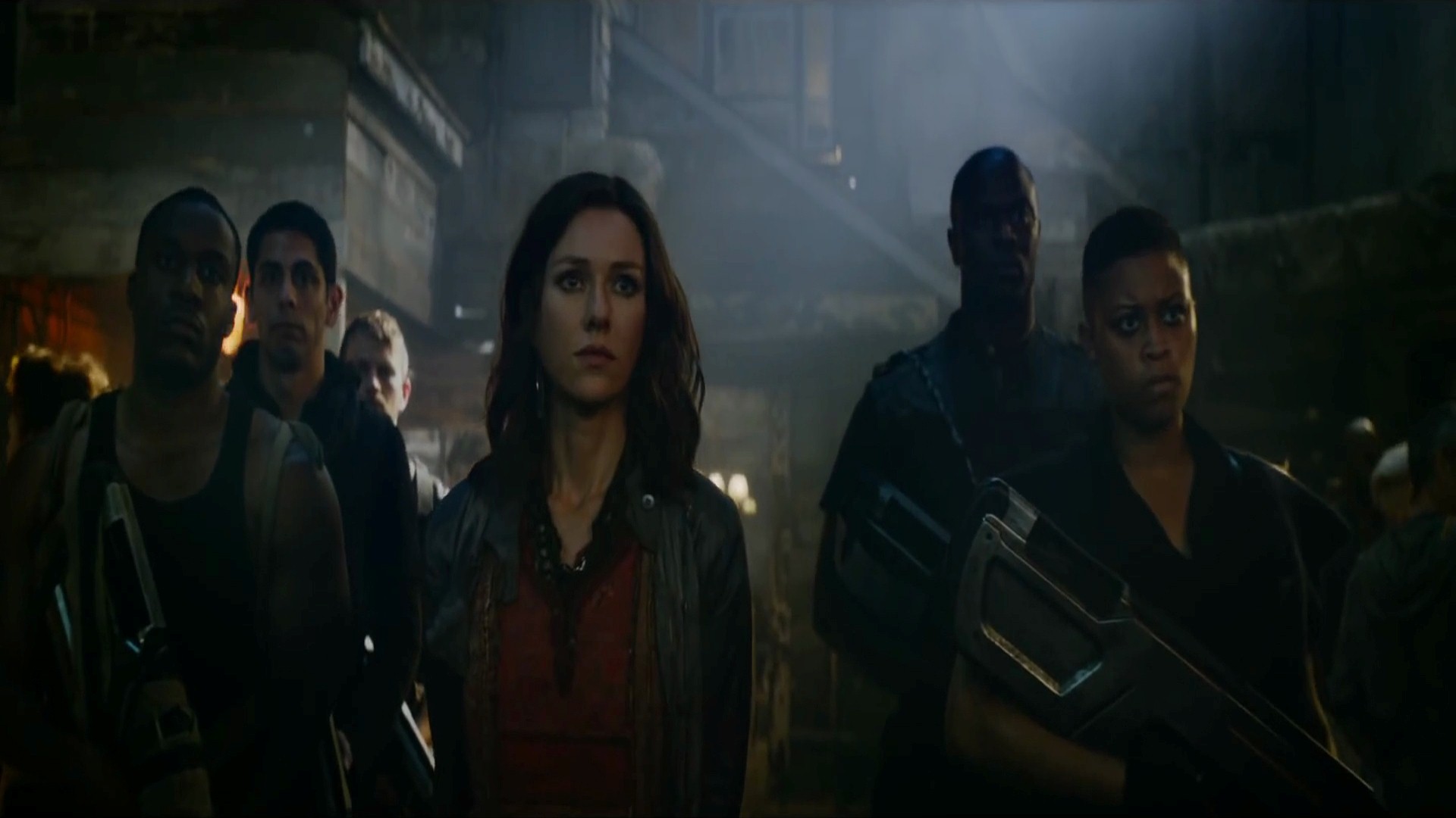 Description: A group of people standing in a dark room with a gun in their hand and a woman holding a gun.