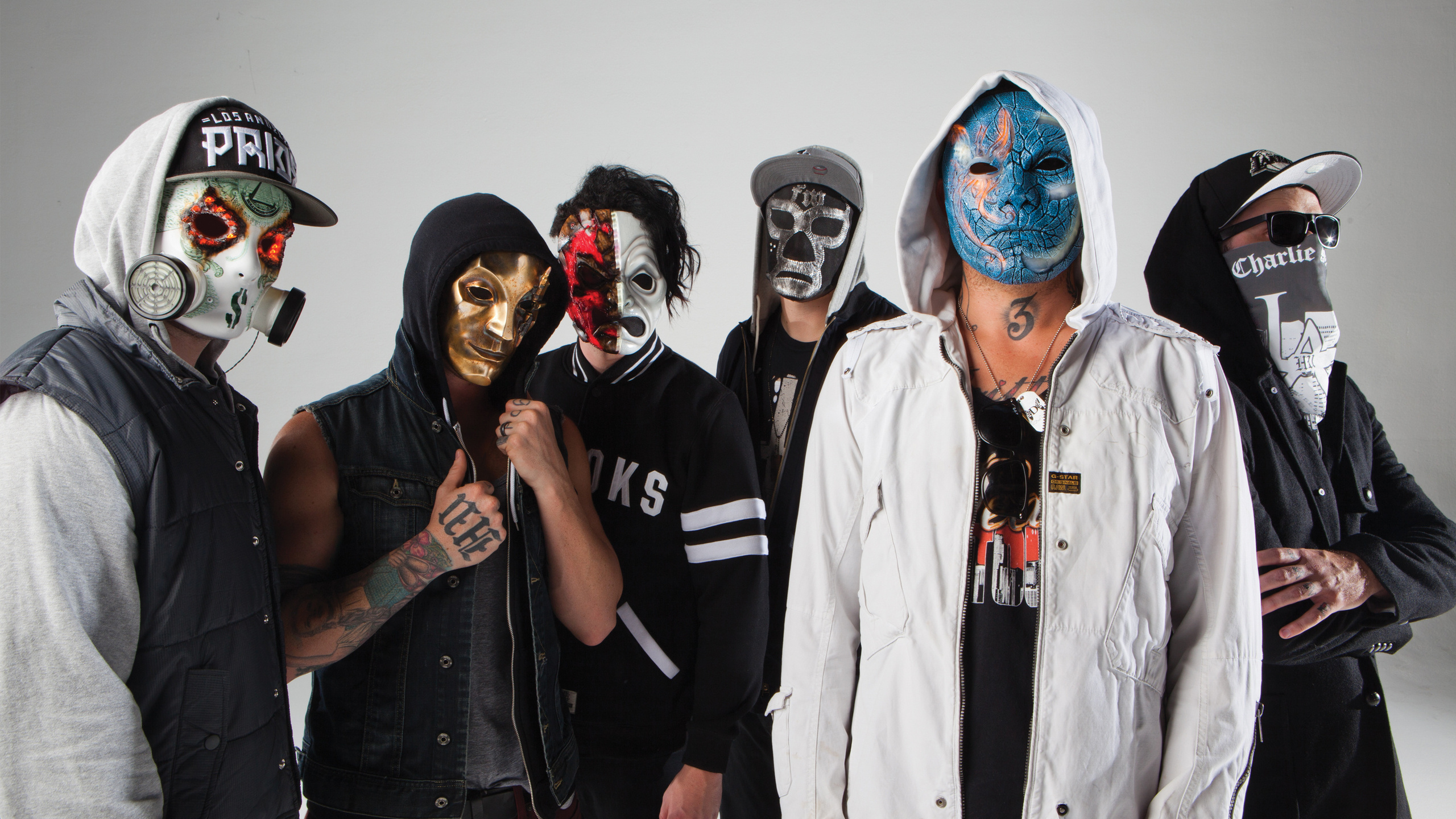 Description: A group of people with painted faces and masks on their faces and one person holding a microphone in front of them.