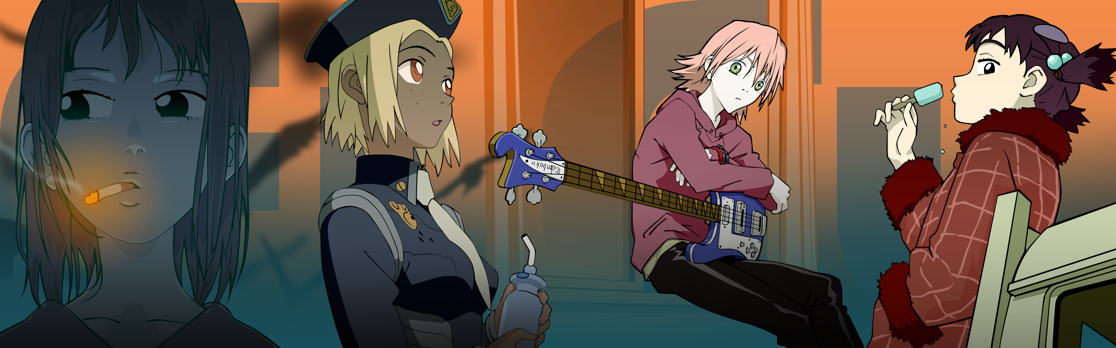 Description: A group of people standing around each other with a guitar in their hand and a person holding a cell phone.