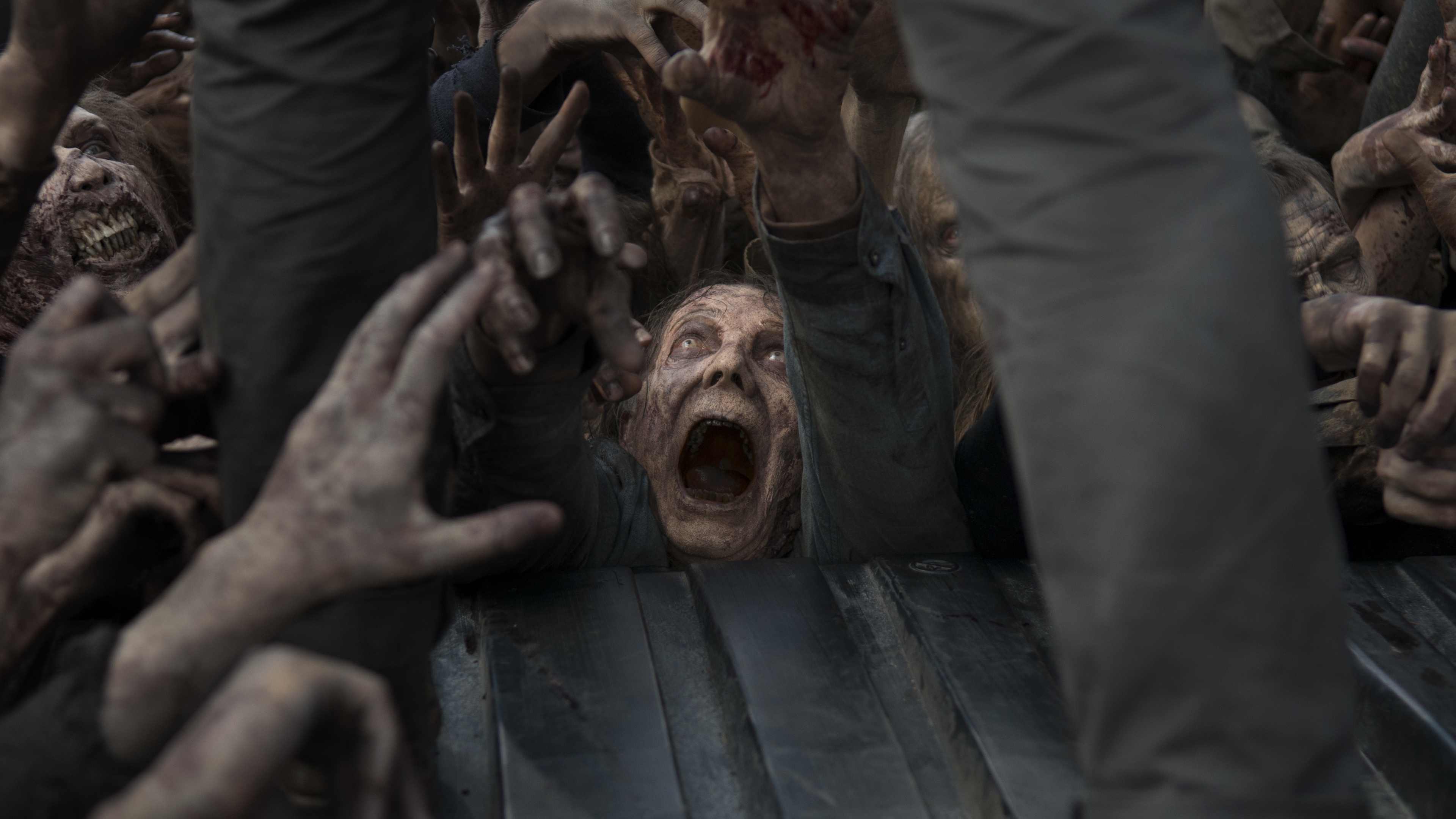 Description: A group of people with their hands in the air and a person with their head in the middle of the group.