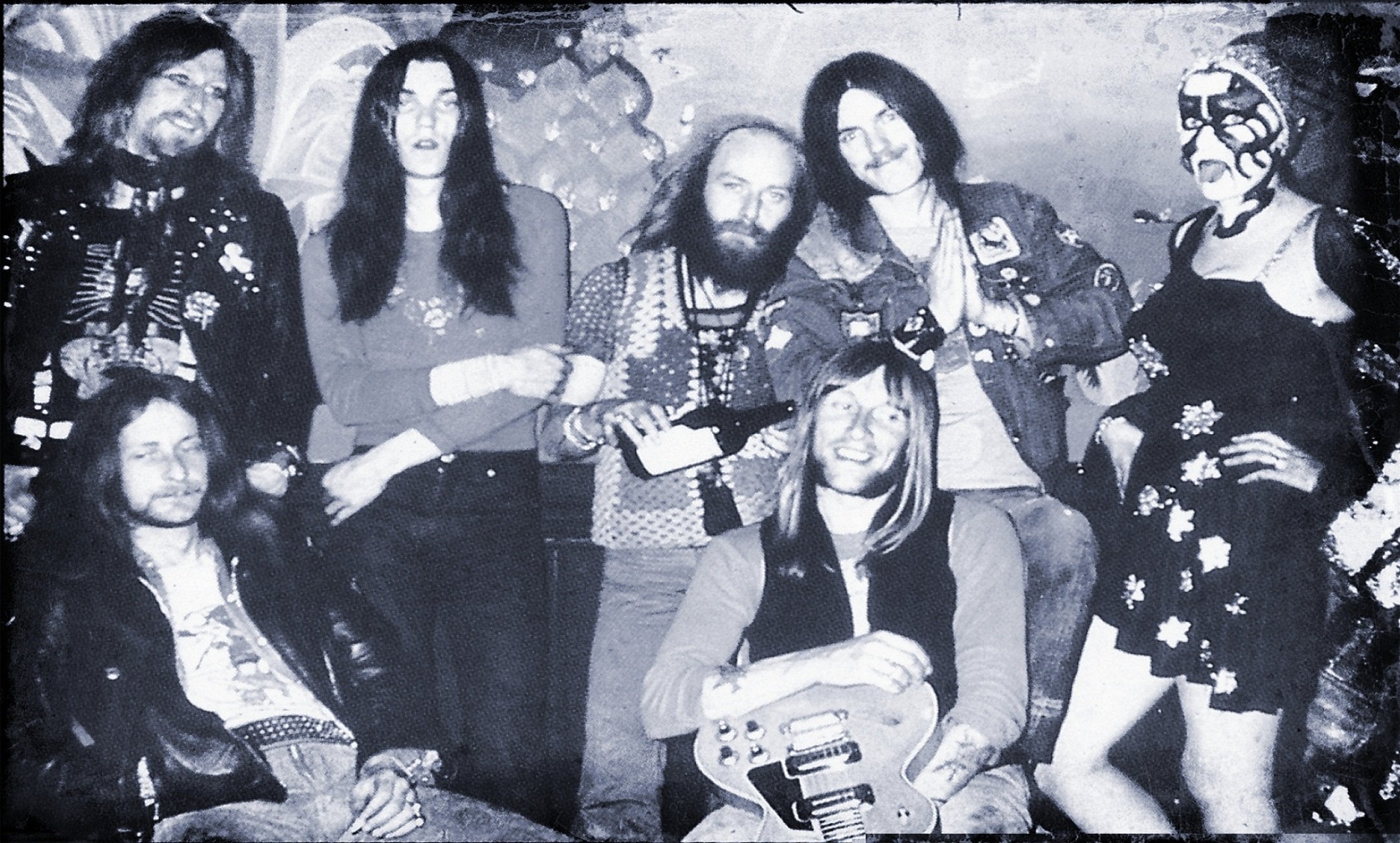Description: A group of people with makeup on posing for a picture together with a guitar and a microphone in their hands.