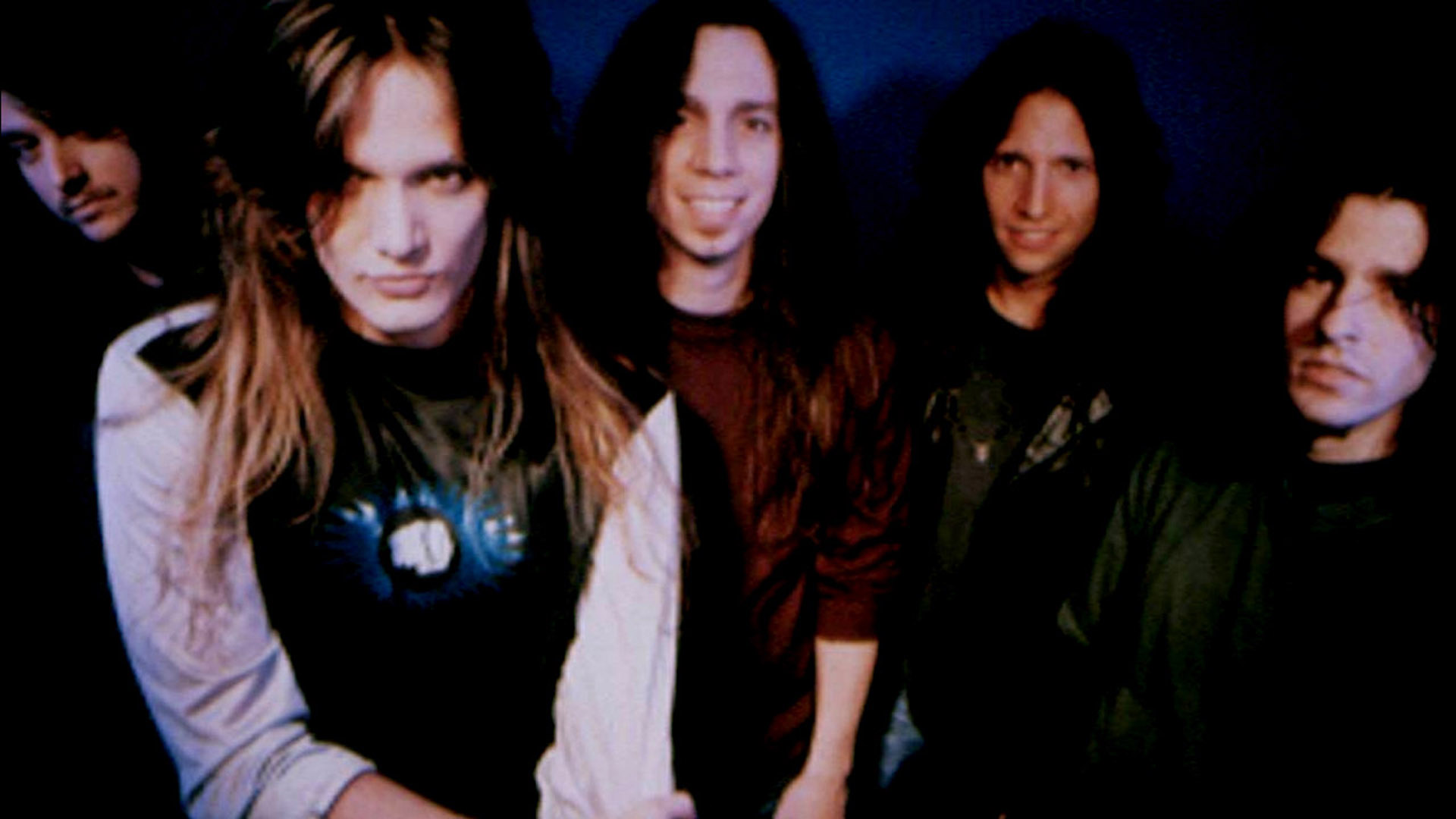 Description: A group of men standing next to each other in front of a blue wall with a black background and a white shirt.