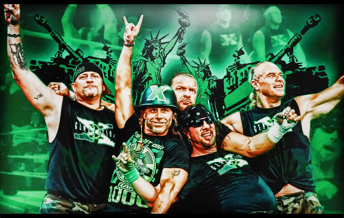 Description: A group of men standing next to each other in front of a green background with a green light behind them.