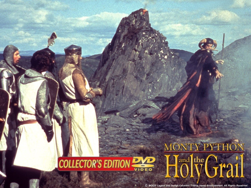 Description: A group of people standing around a mountain with a sky background and a movie title above it that reads.