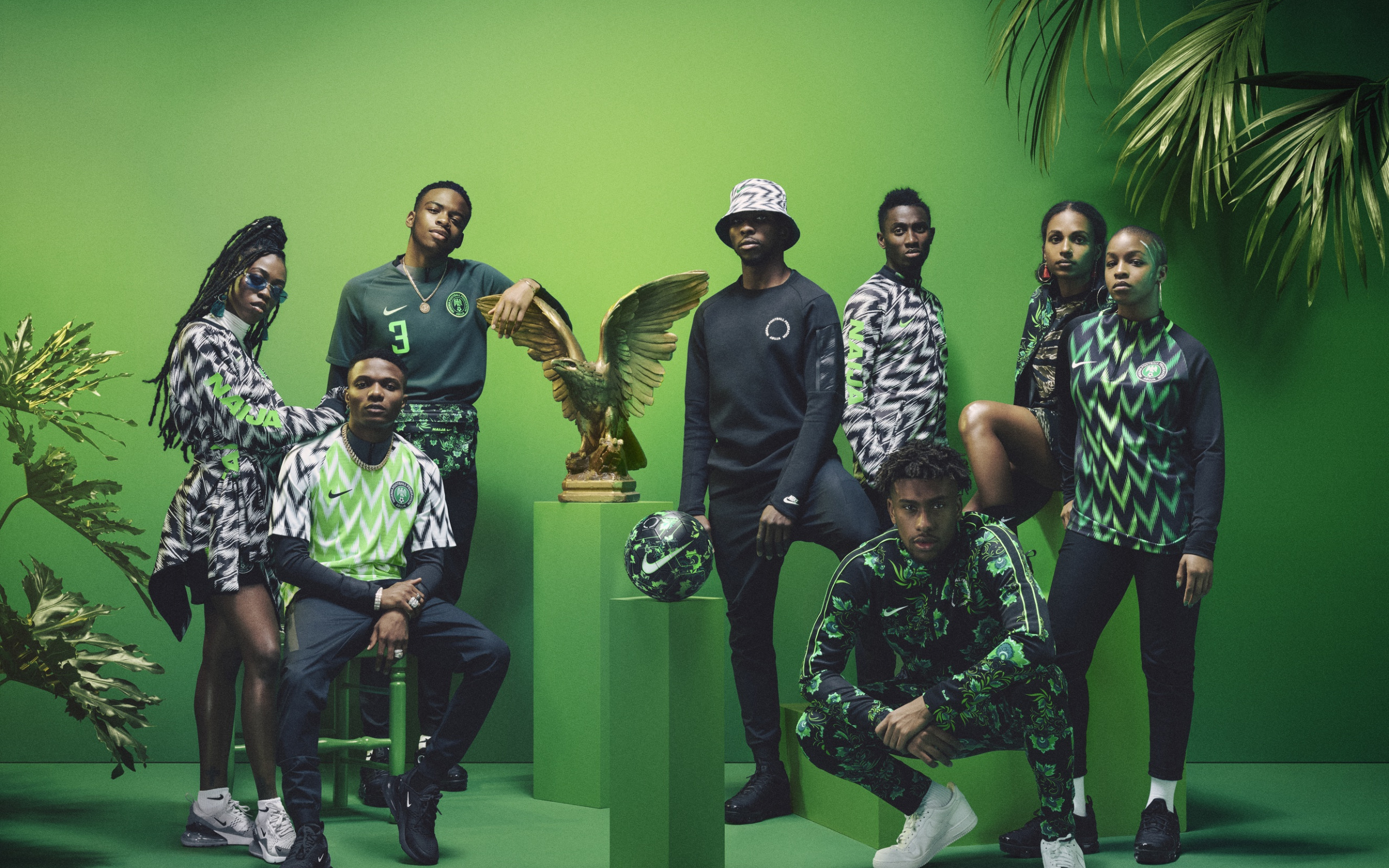 Description: A group of people posing for a picture in front of a green wall with a statue of a bird.