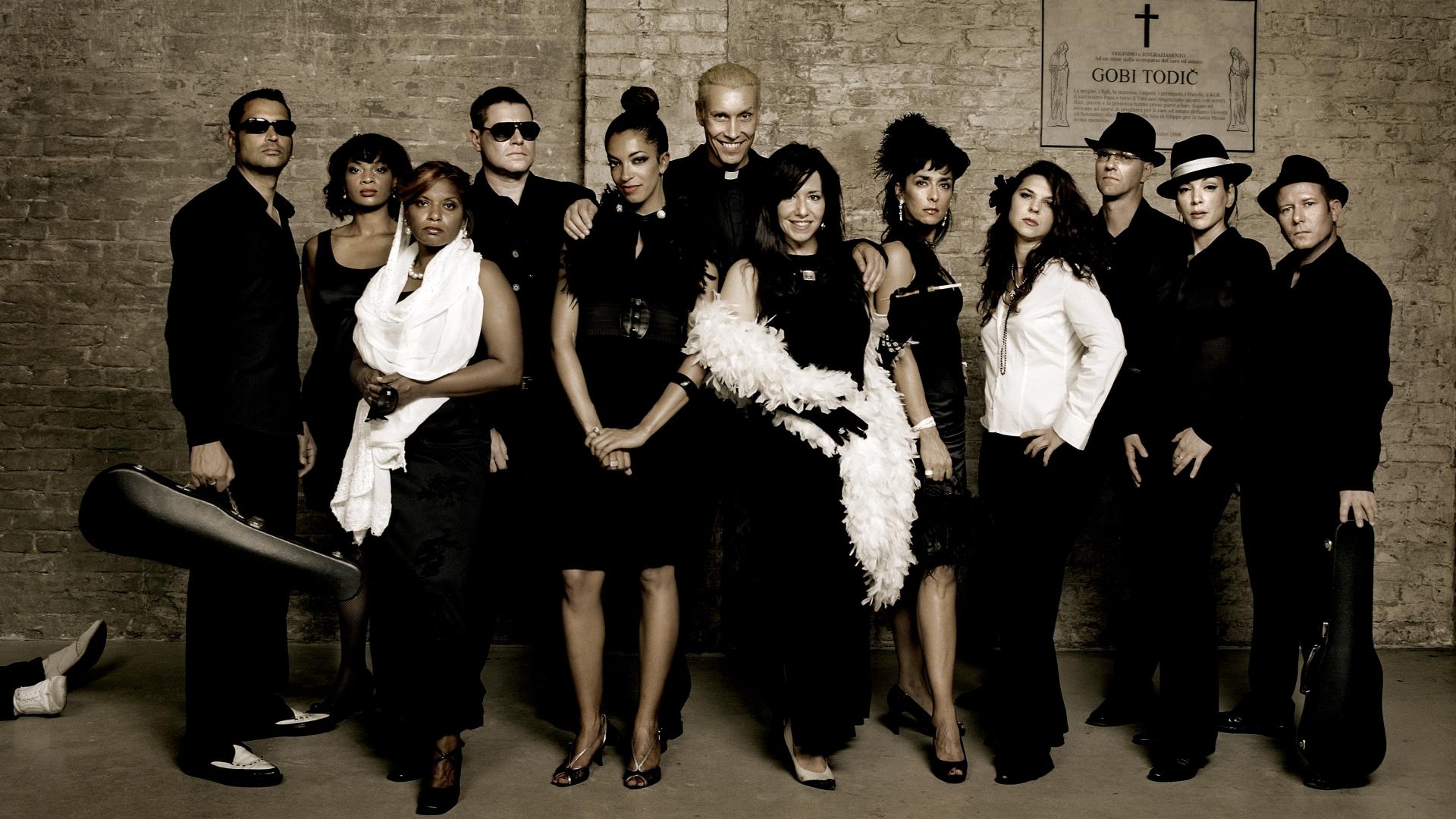 Description: A group of people standing next to each other in front of a brick wall with a sign on it.