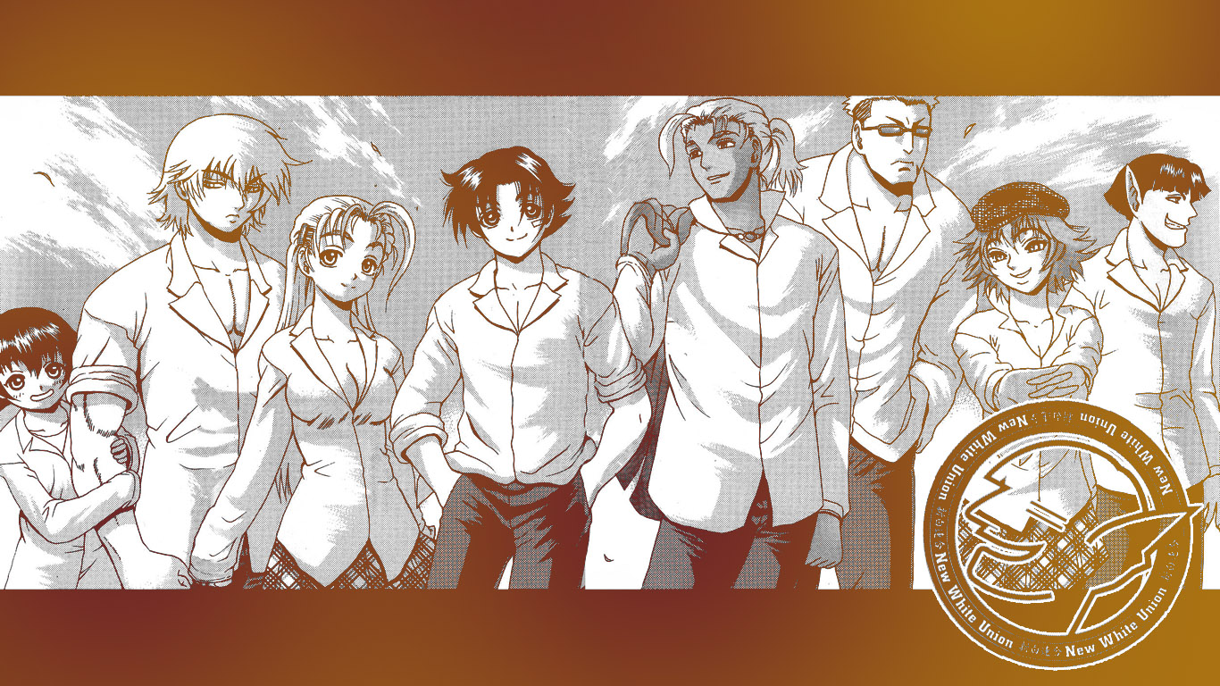 Description: A group of people standing next to each other in front of a brown and white background with a seal.