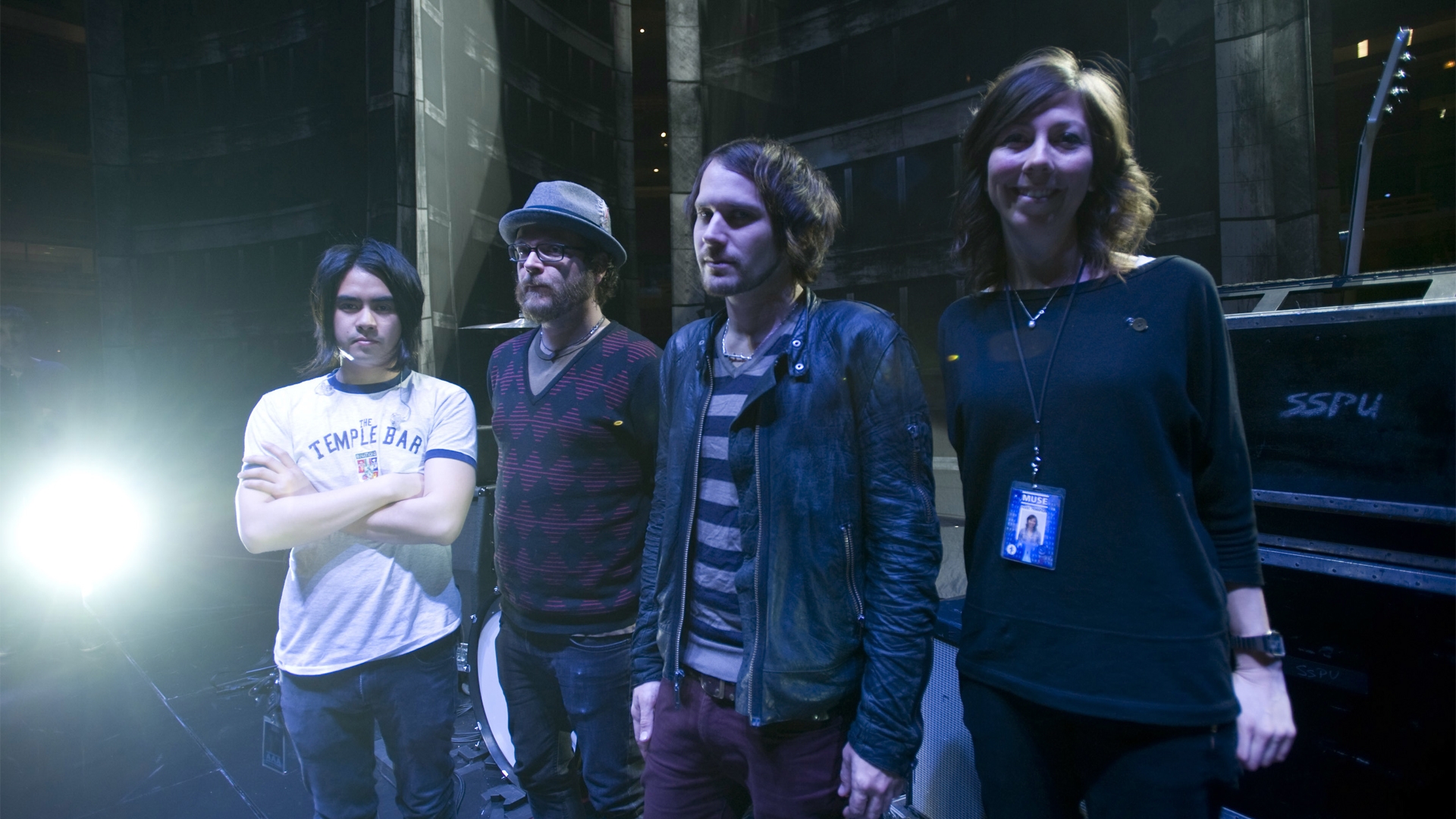 Description: A group of people standing next to each other in front of a building with a light on it's side.