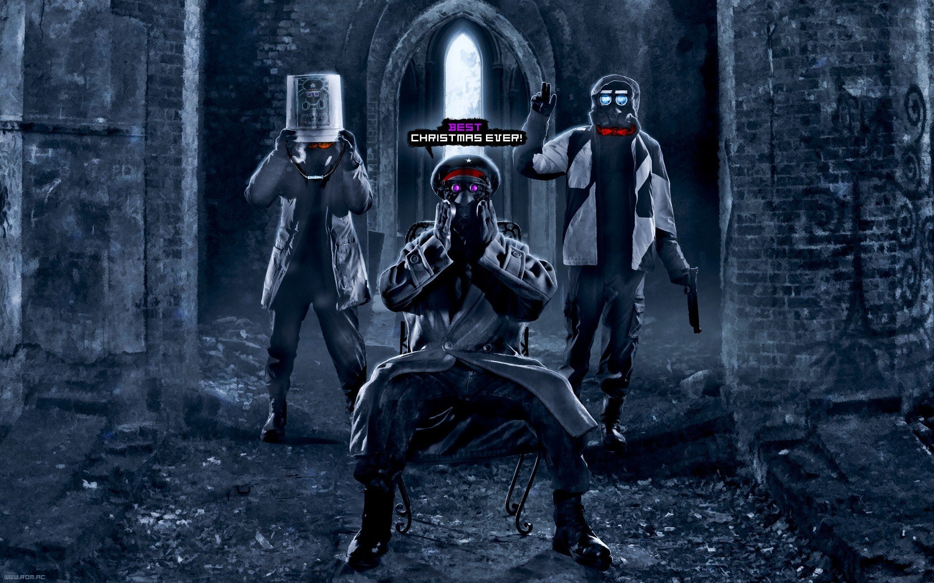 Description: A group of people standing in a dark room with a brick wall and a doorway with a door and a brick wall.