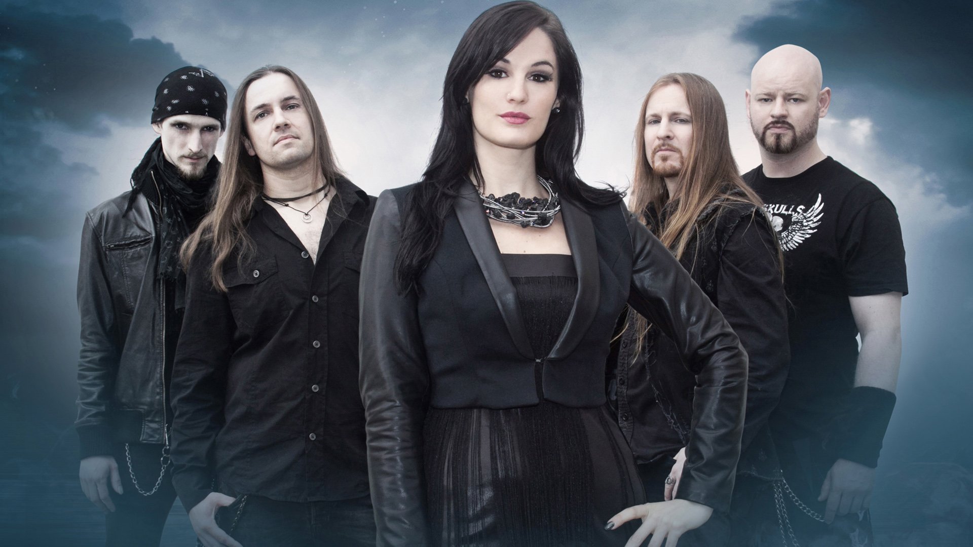 Description: A group of people standing in front of a dark sky with clouds and a sky background with a woman in a black dress.