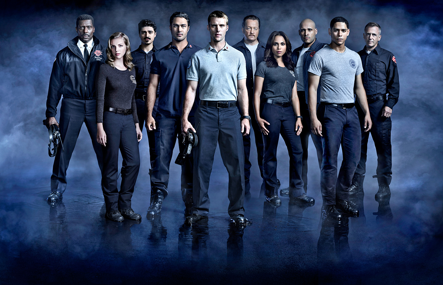 Description: A group of people standing in a group in the dark with smoke behind them and a man in the middle of the group.
