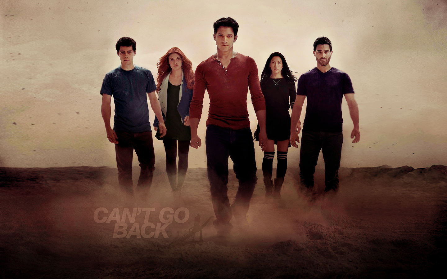 Description: A group of people standing in a dirt field with a sky background and a can't go back sign.