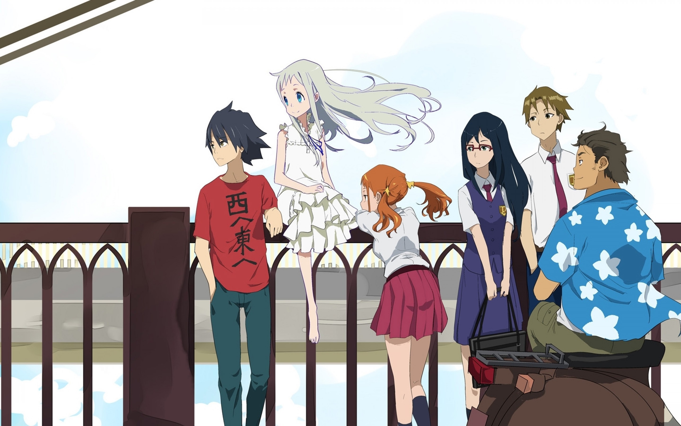 Description: A group of people standing next to each other near a fence and a river with a bridge in the background.