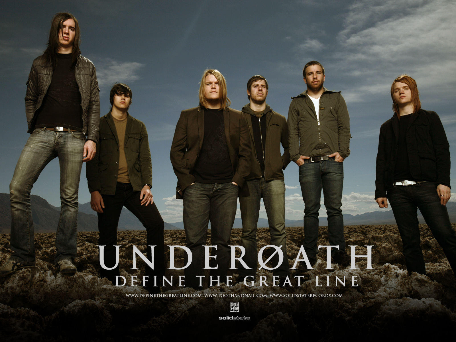 Description: A group of people standing in a field under a cloudy sky with the words underoath written below.