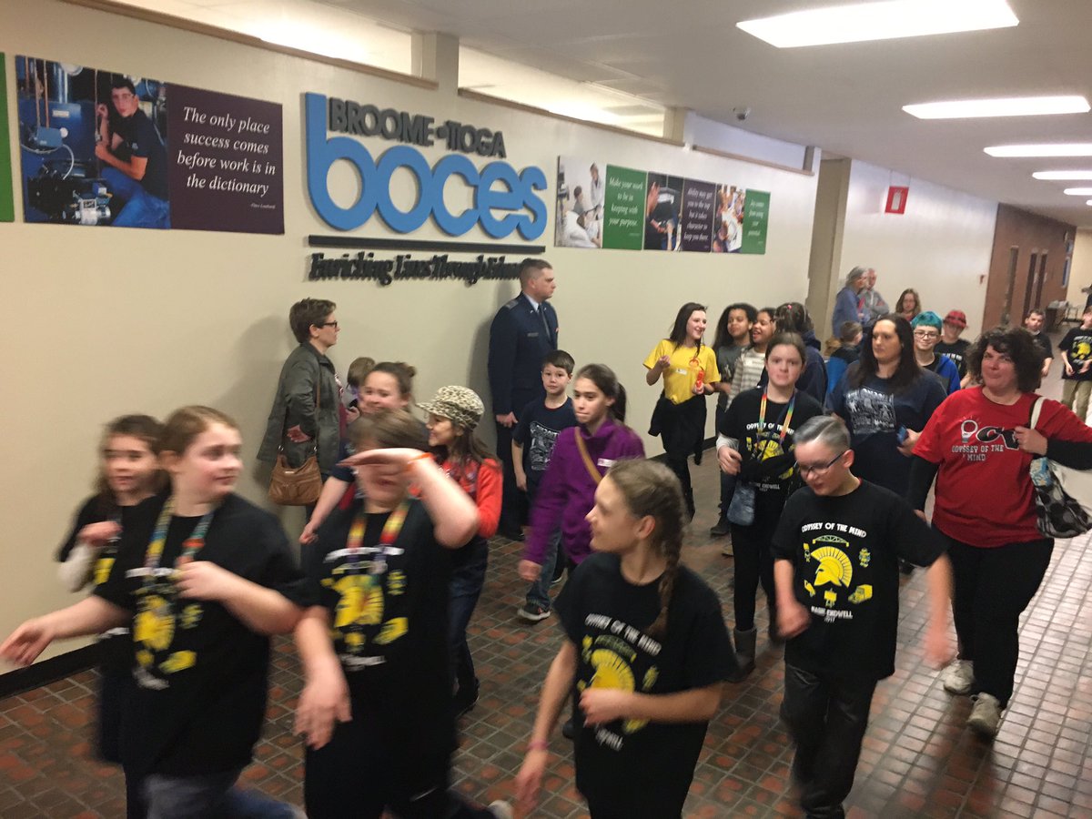Description: A group of people standing in a hallway next to a wall with posters on it and a man holding a microphone.