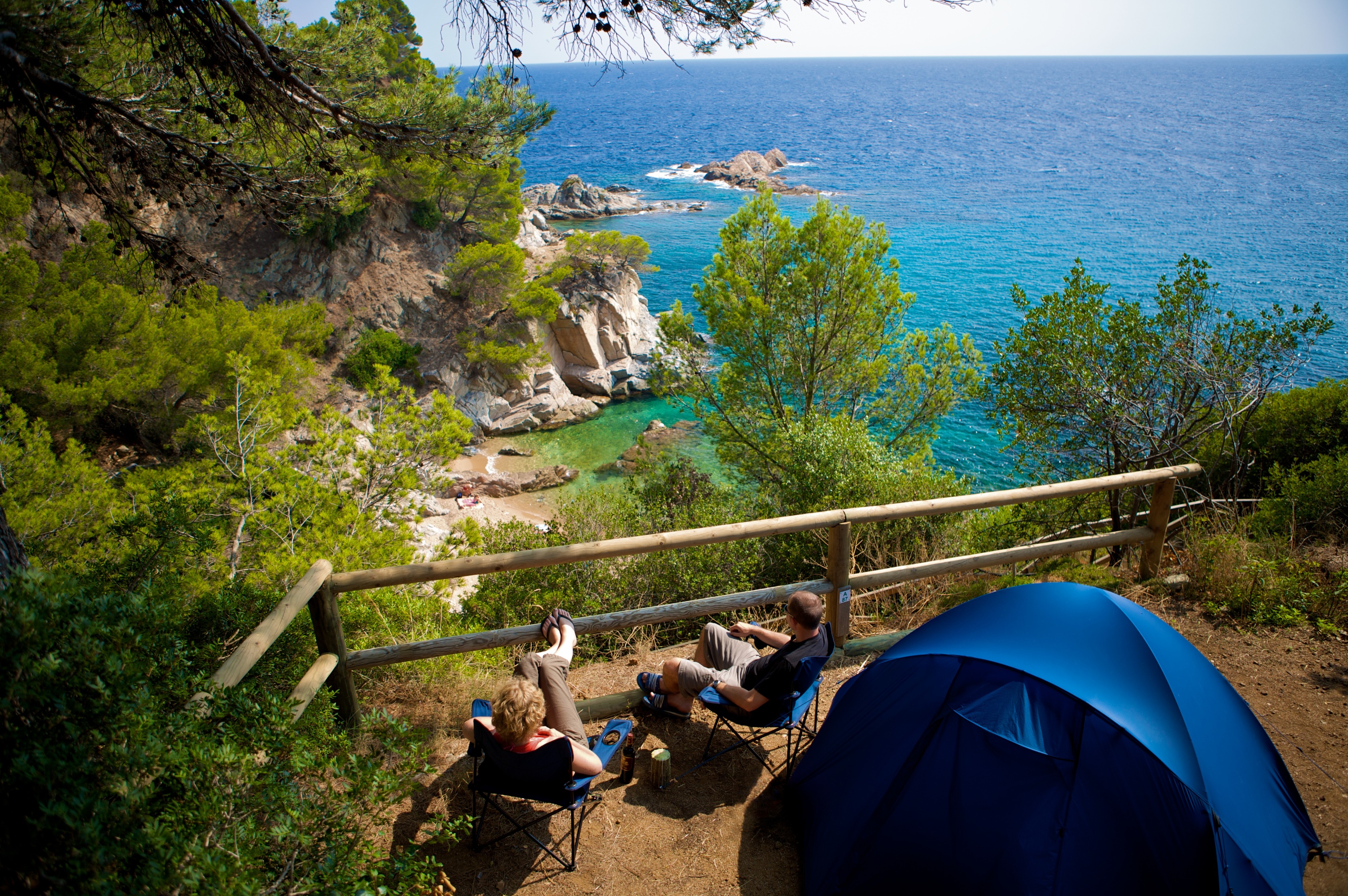 Description: A group of people sitting on a hill next to a blue tent and a body of water with a blue sky.