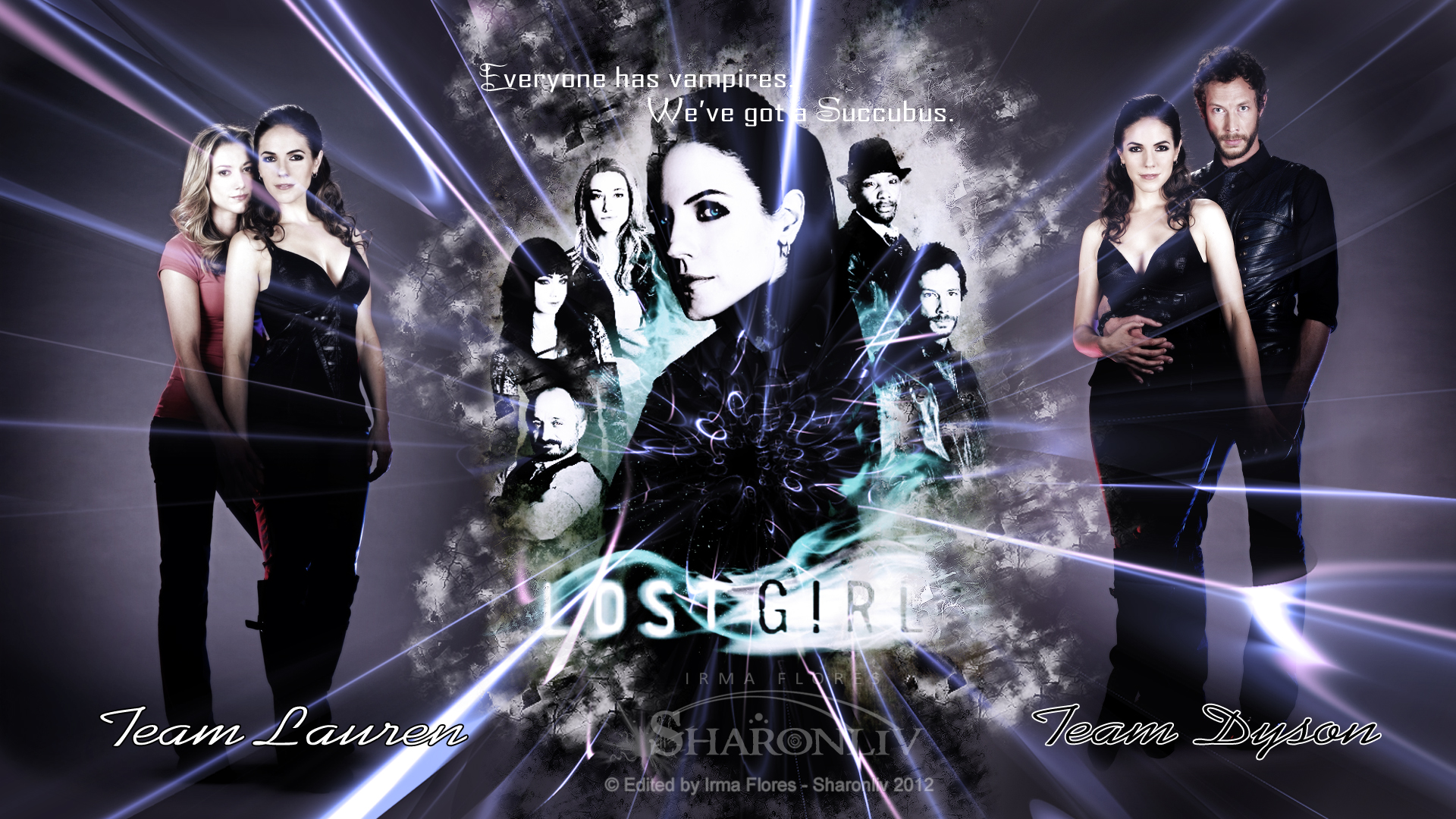 Description: A group of people standing in front of a poster of them in black and white colors with a blue light.