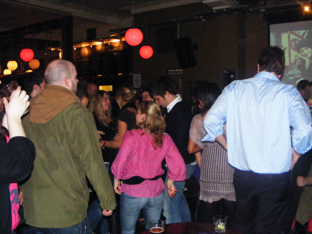 Description: A group of people standing around a room with a projector screen in the background and red lights hanging from the ceiling.