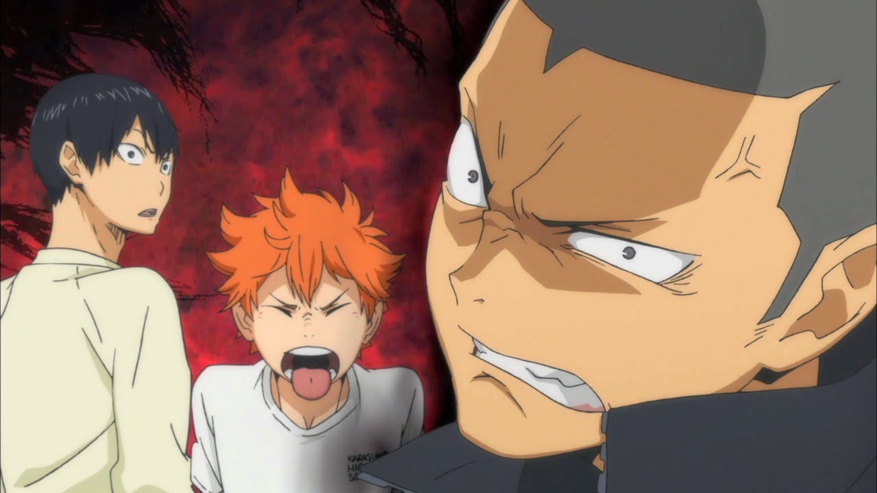 Description: A group of people standing around each other in front of a red background with a demon on it's face.