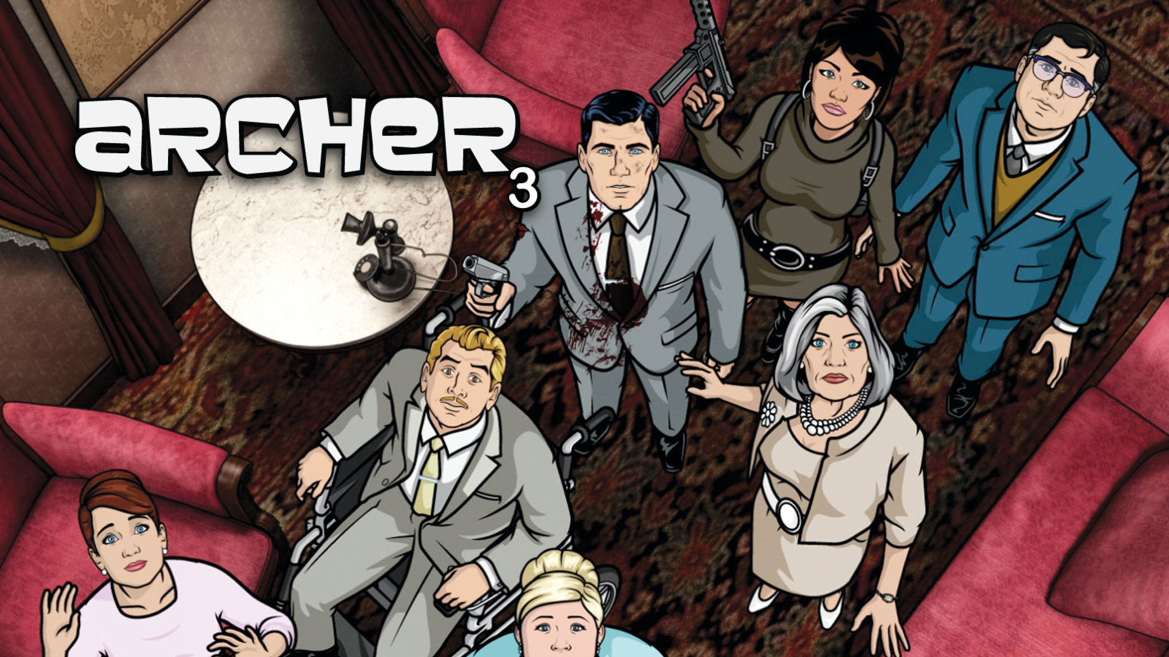 Description: A group of people standing around a red couch in a room with a red carpet and a red couch.