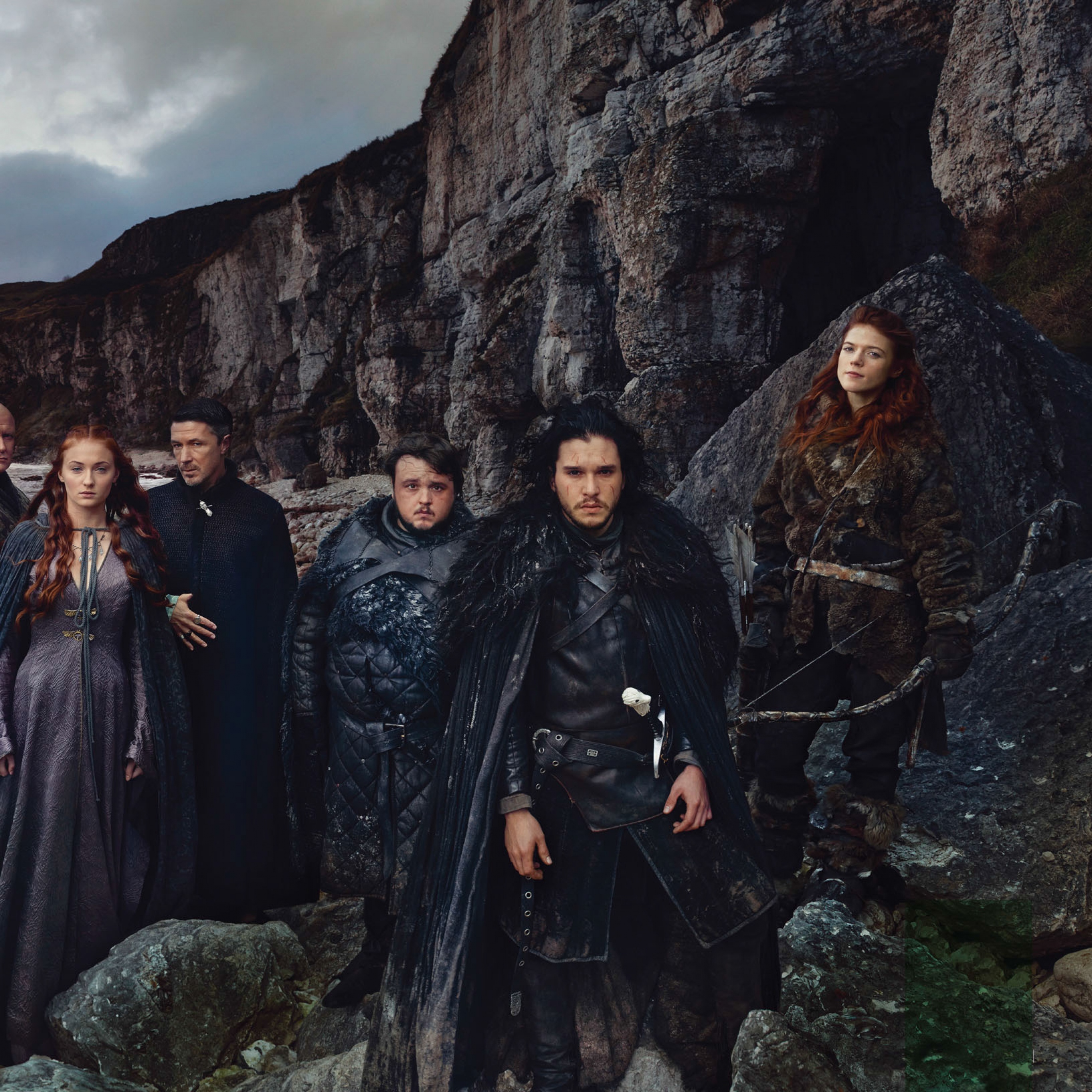 Description: A group of people standing on a rocky hillside next to a mountain range with a dark sky in the background.