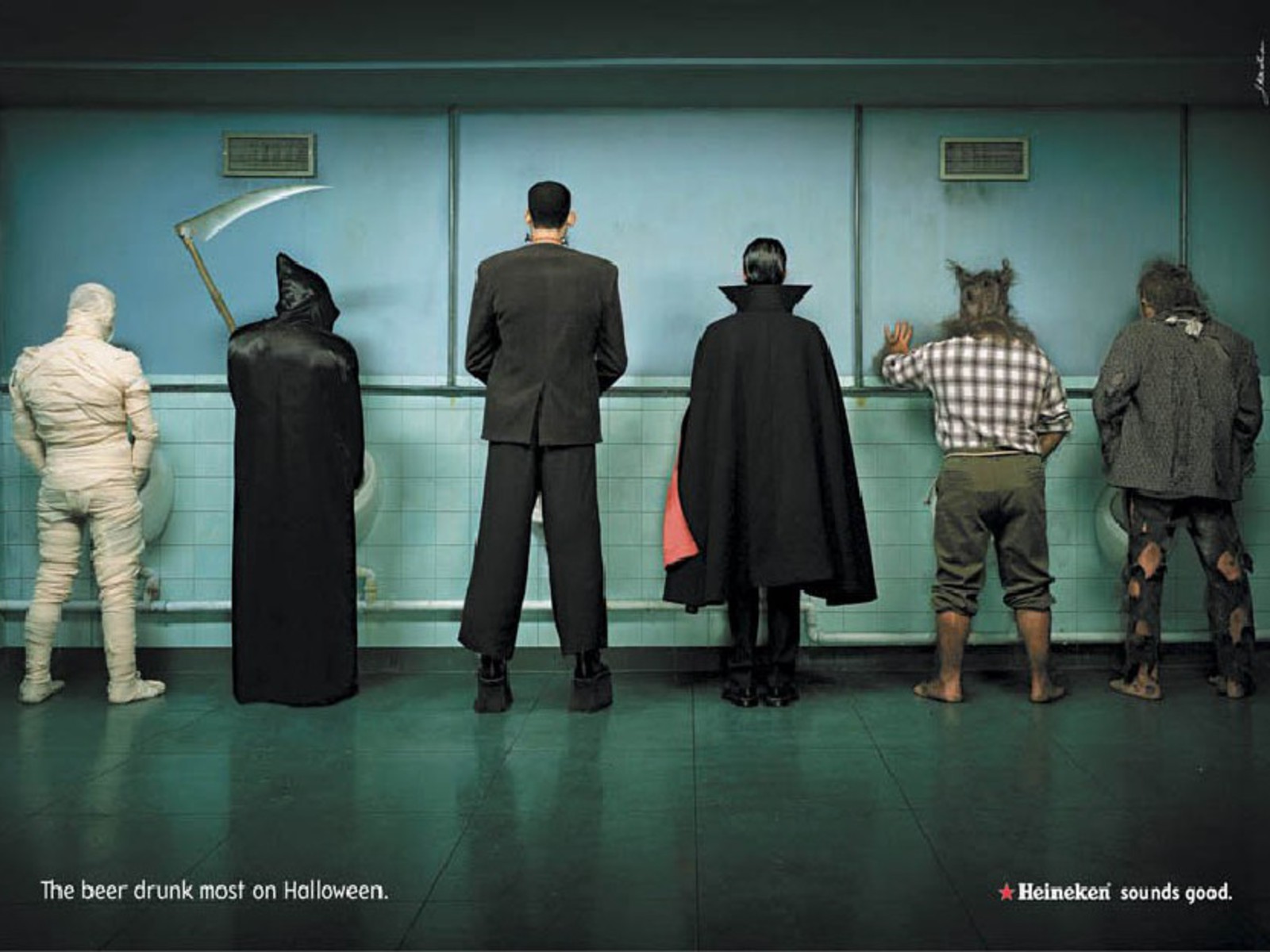 Description: A group of people standing in a room with a wall painted blue and white with a painting of a man with a hammer.