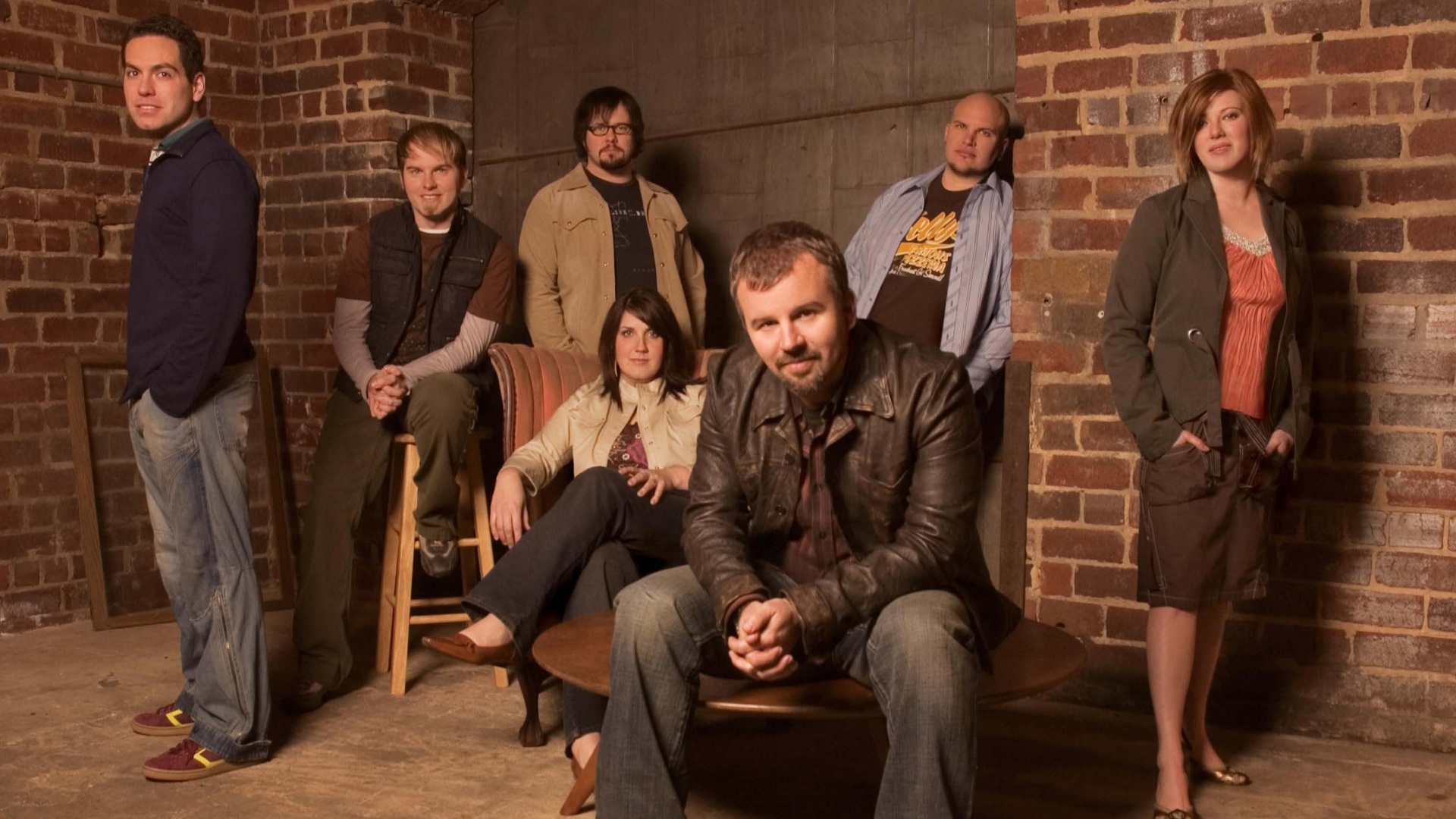 Description: A group of people standing and sitting in a room with brick walls and a brick wall behind them.