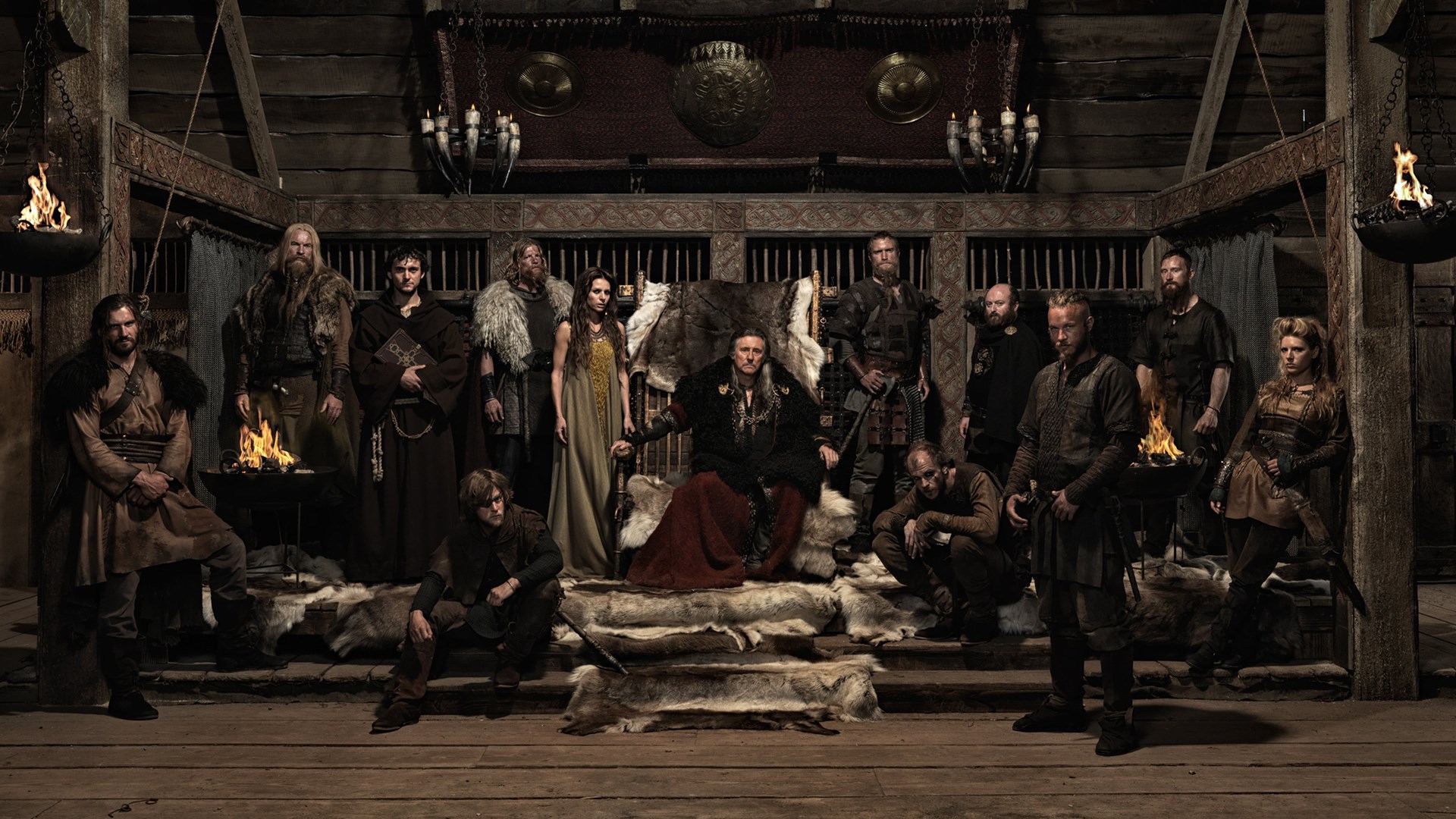 Description: A group of people standing around each other in a room with a fire place in the middle of the room.