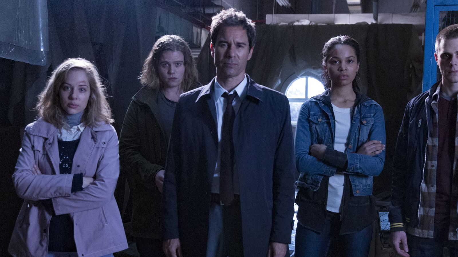 Description: A group of people standing in a room with one man in a tie and the other woman in a coat.