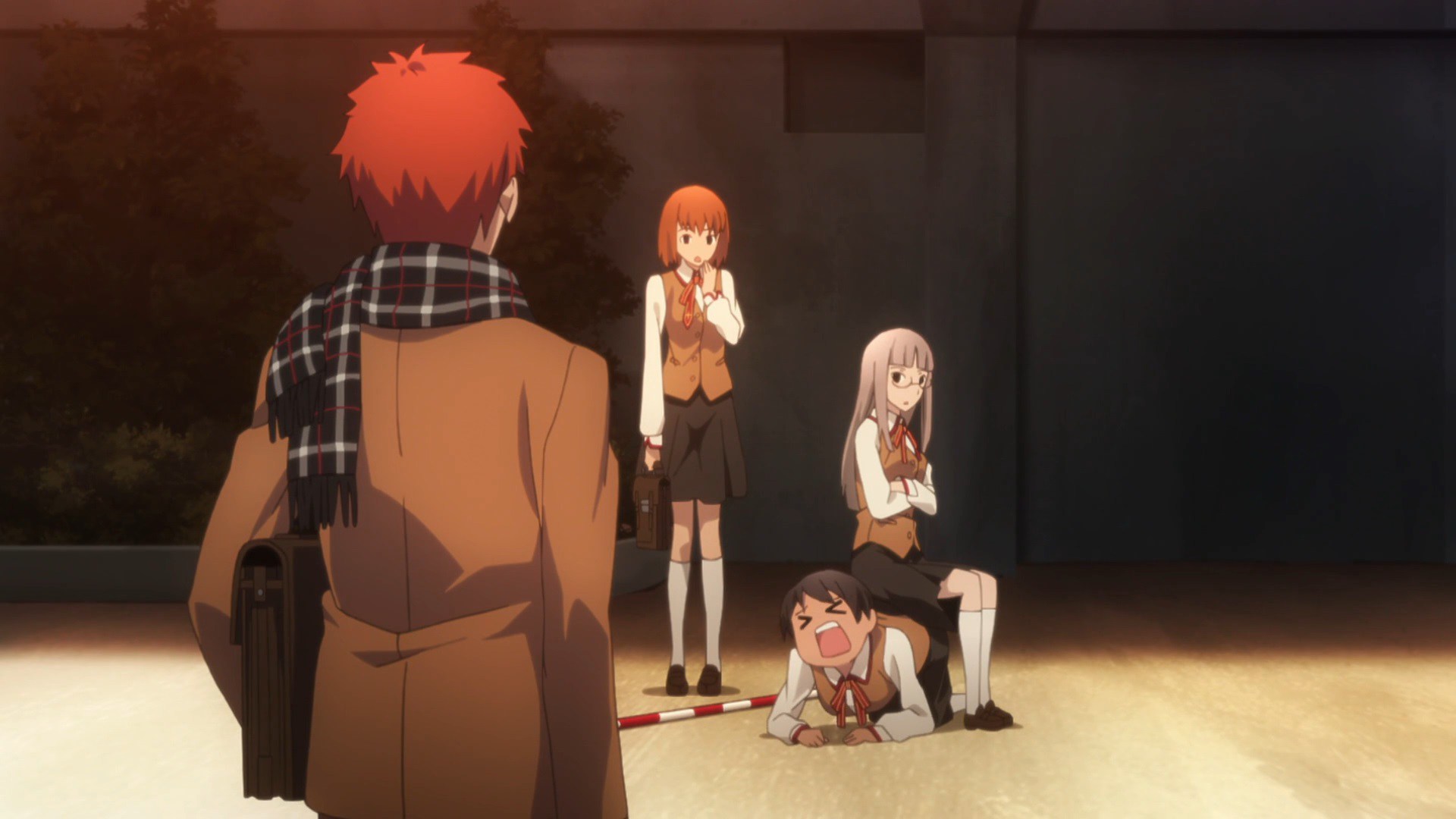 Description: A group of people standing around a room with a person sitting on the floor next to them and another person standing behind them.