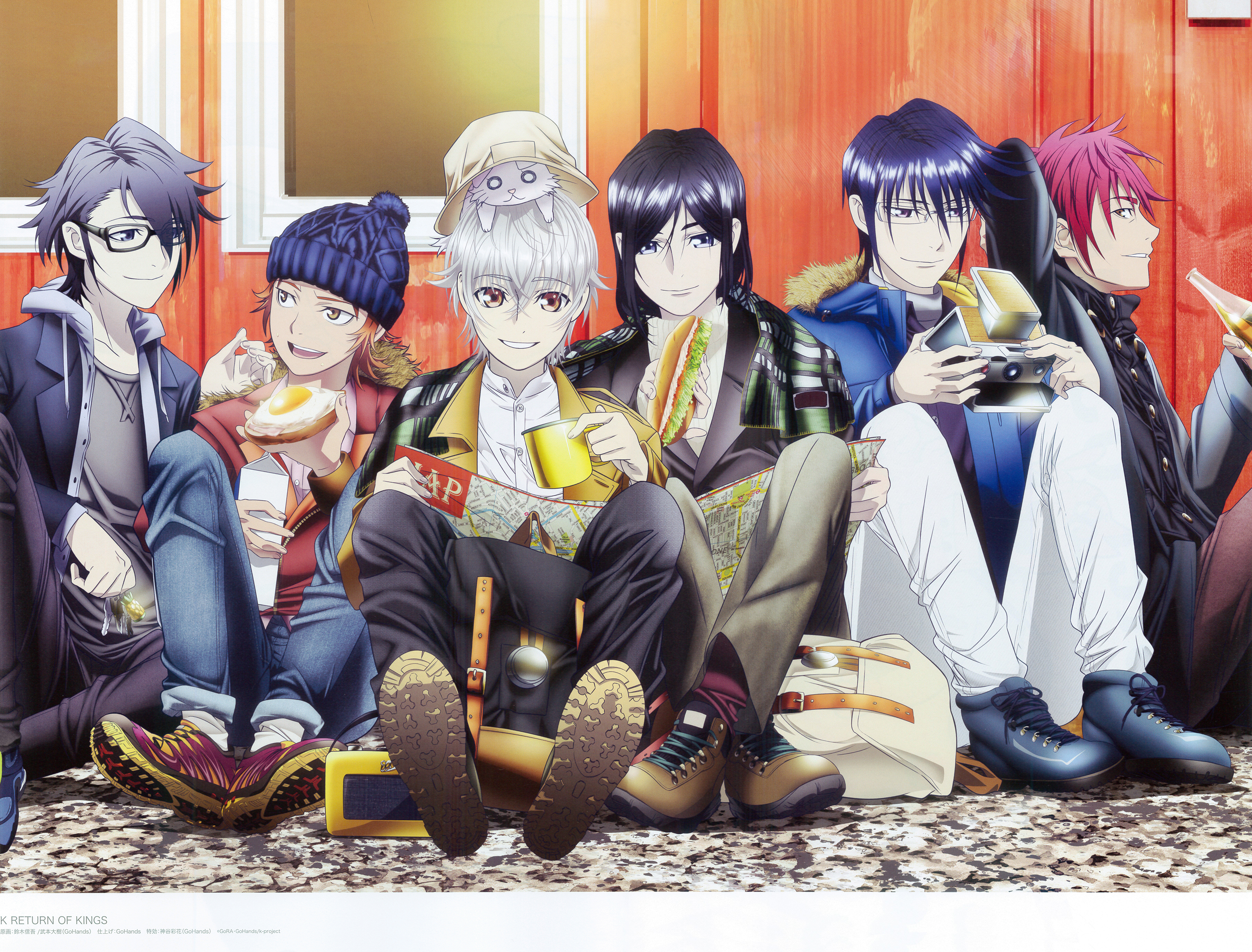 Description: A group of people sitting next to each other on a floor next to a building and a red door.