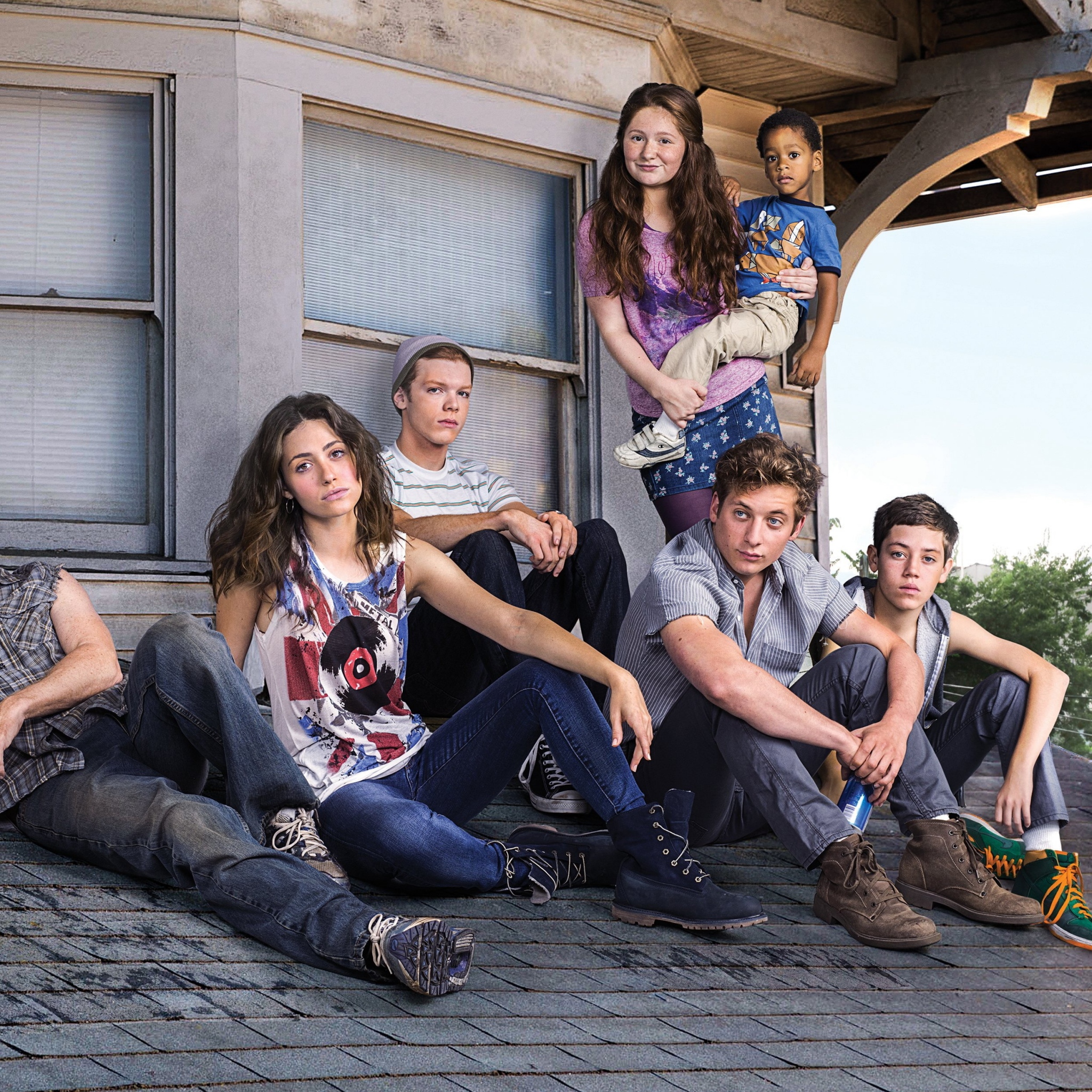 Description: A group of people sitting on the ground next to each other on a porch with a building in the background.