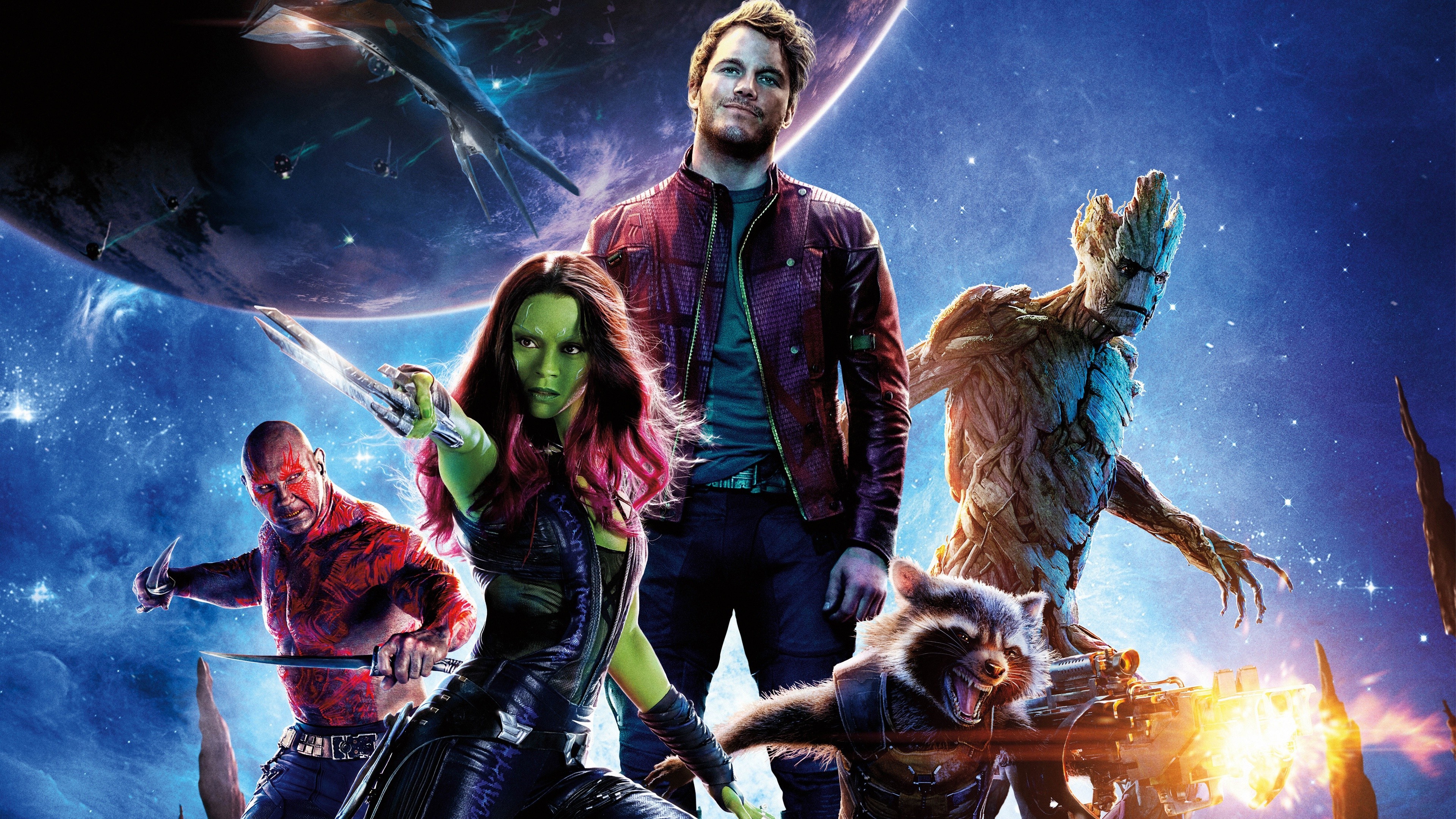Description: A group of people standing in front of a space background with a rocket ship and a rocket ship in the background.