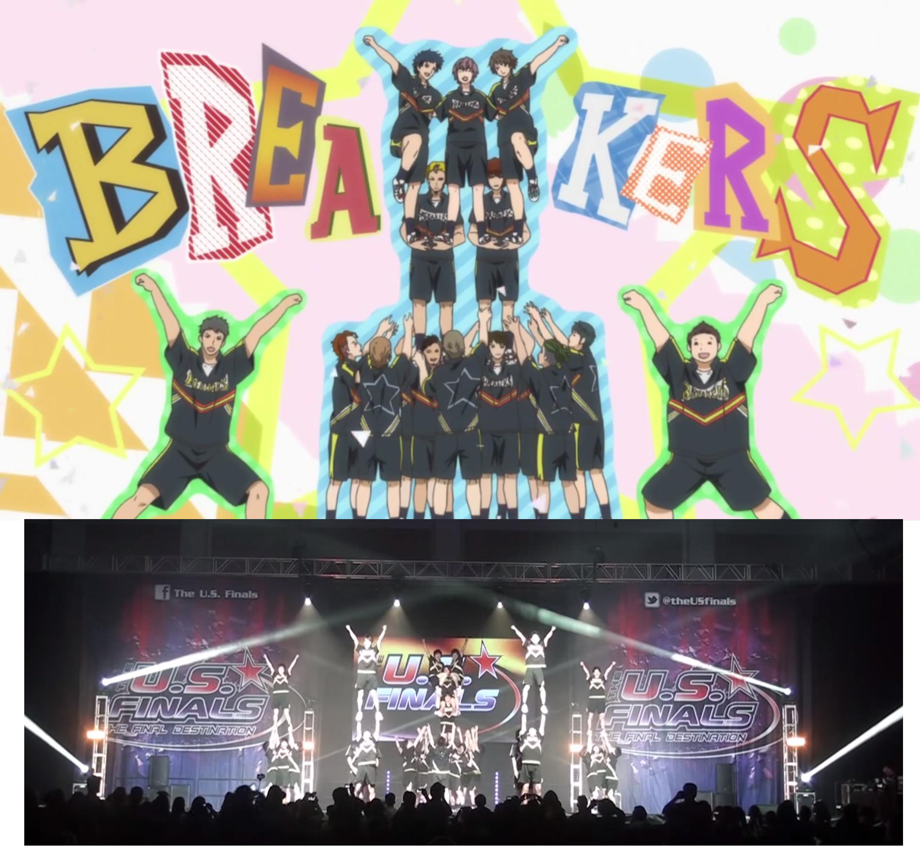 Description: A group of people standing on top of a stage with their hands in the air and the words breakkers on the wall.