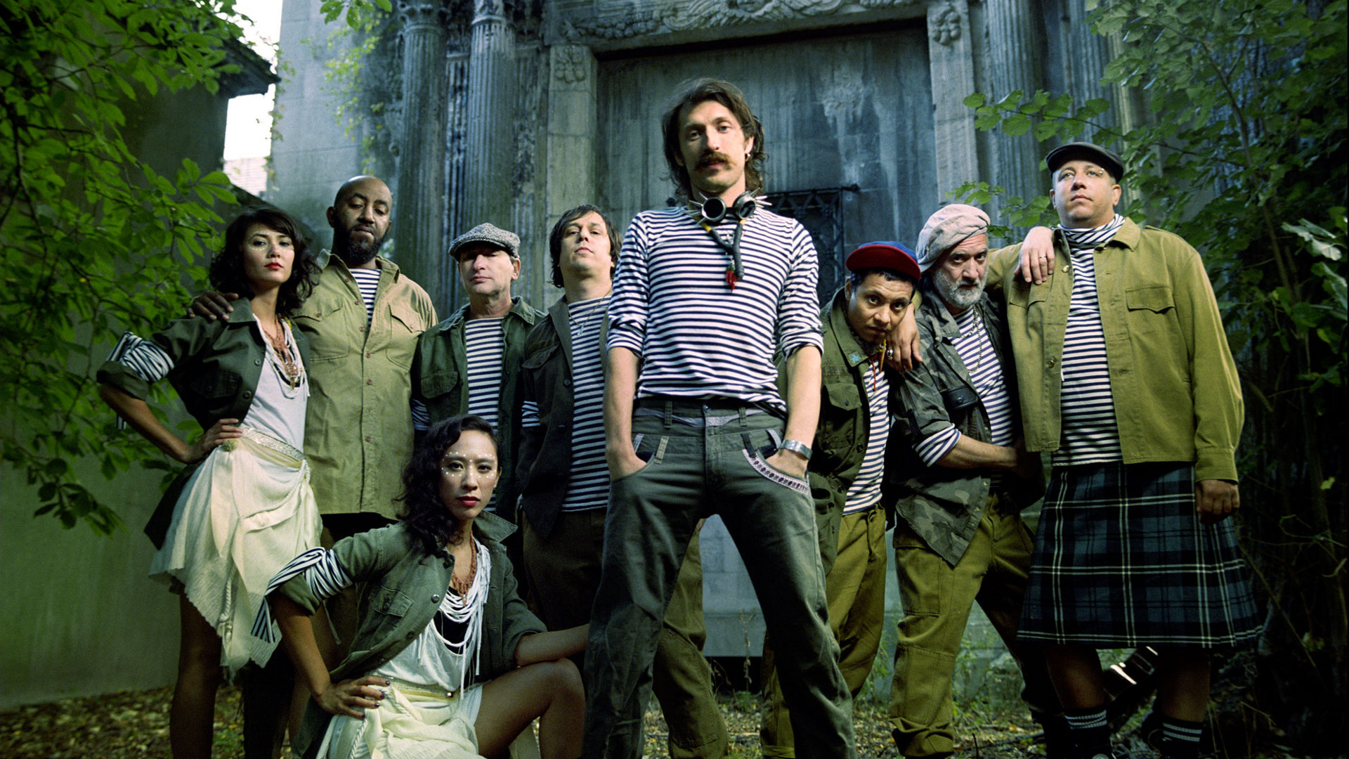 Description: A group of people standing next to each other in front of a door with a man in a striped shirt.