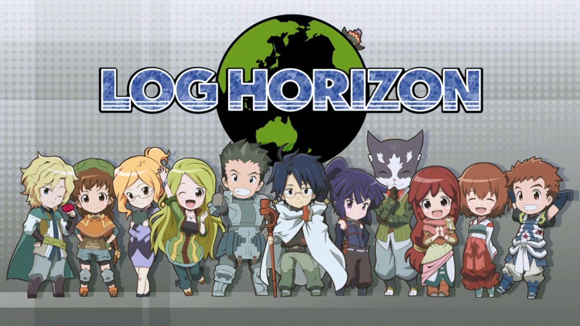 Description: A group of people standing in front of a logo for log horizon.