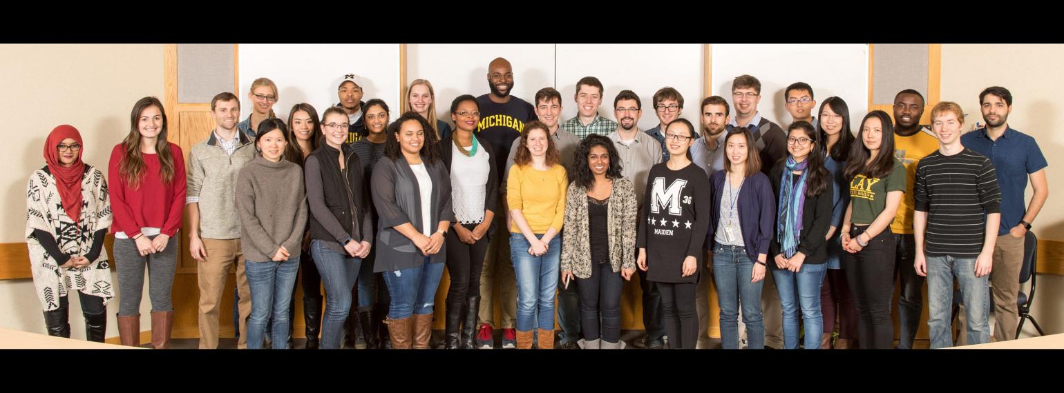 Description: A group of people standing next to each other in front of a wall with a whiteboard in the background.