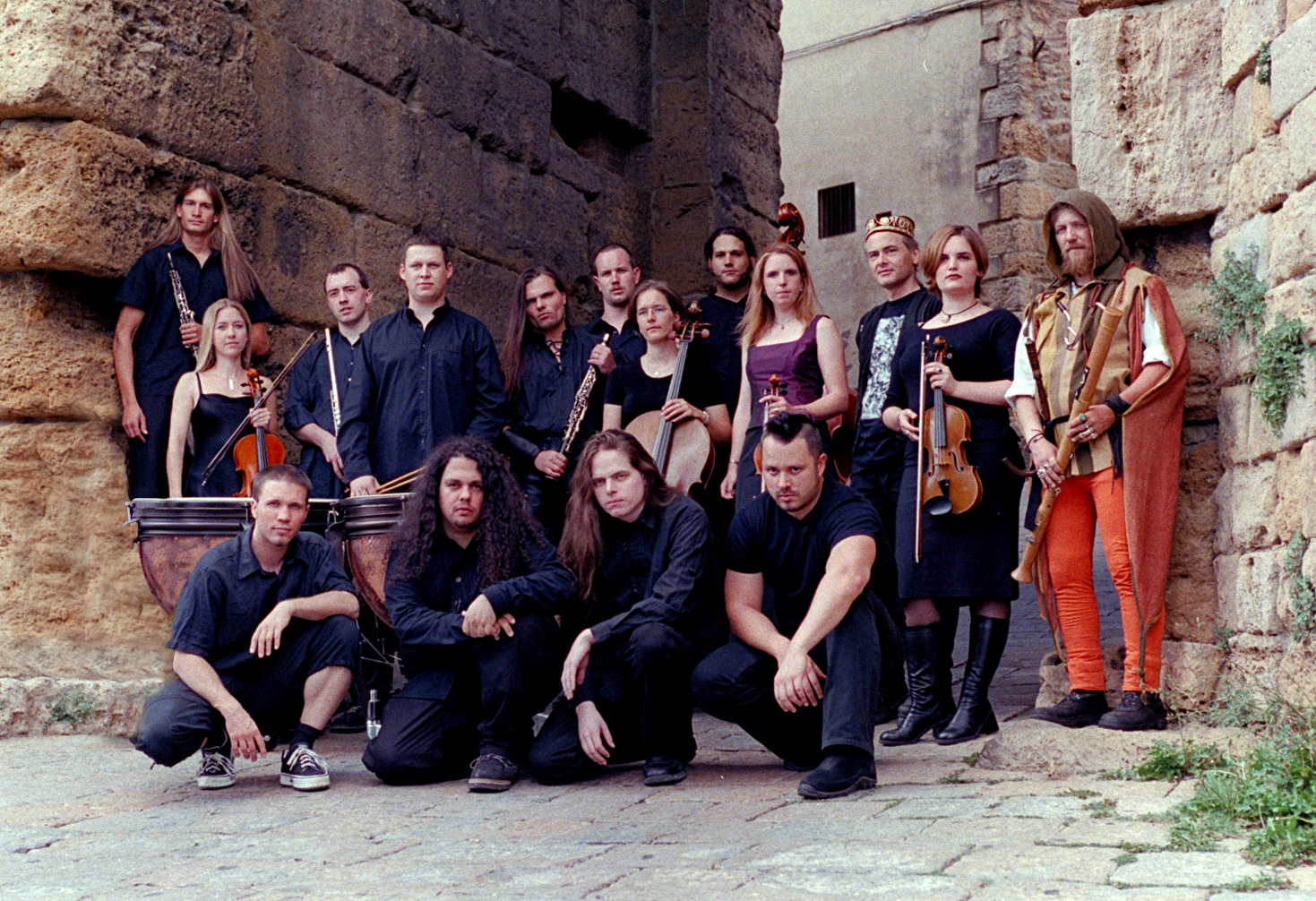 Description: A group of people standing next to each other near a stone wall and a building with a doorway and a doorway.
