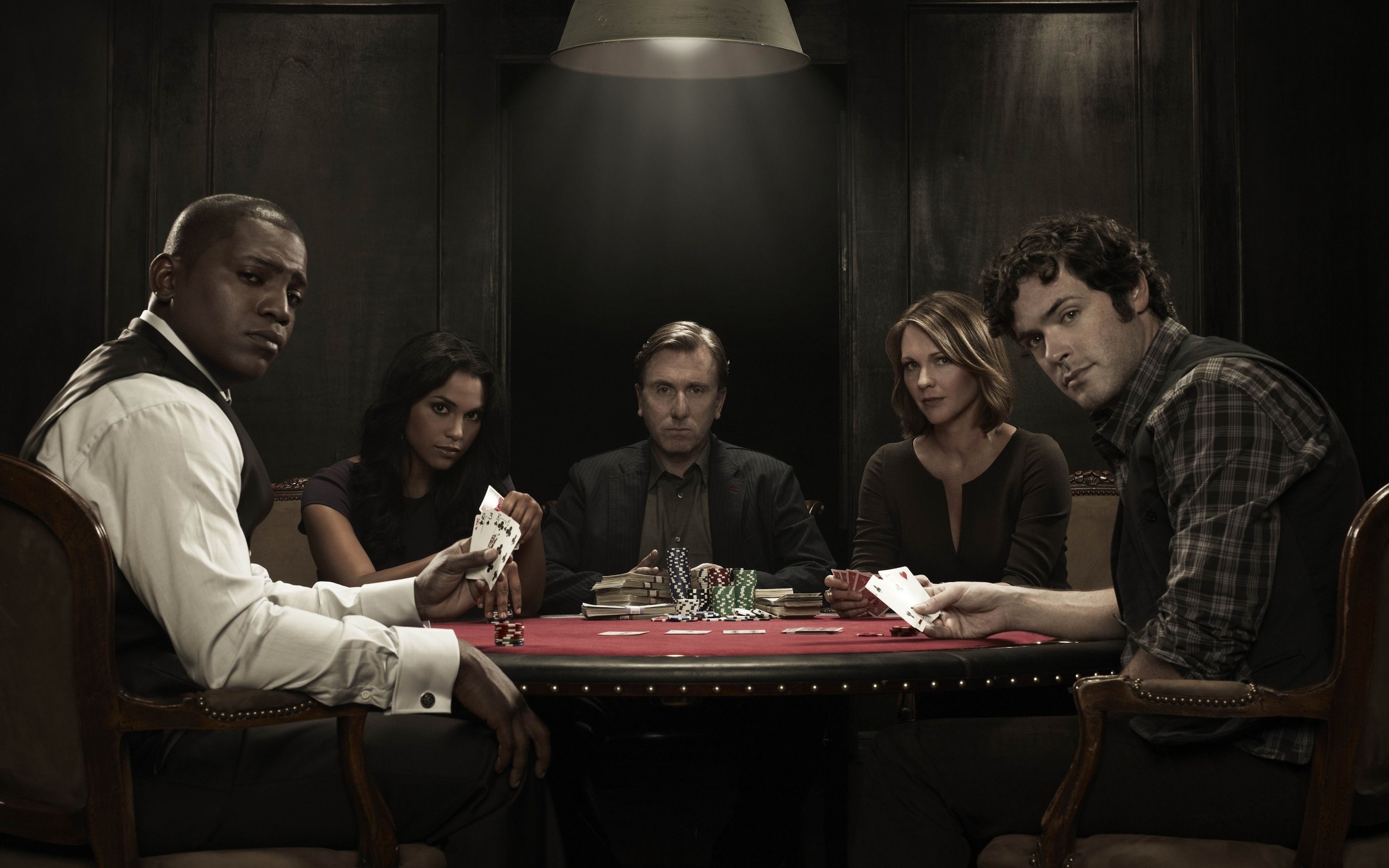 Description: A group of people sitting around a table with cards on it and a lamp above them in a dark room.