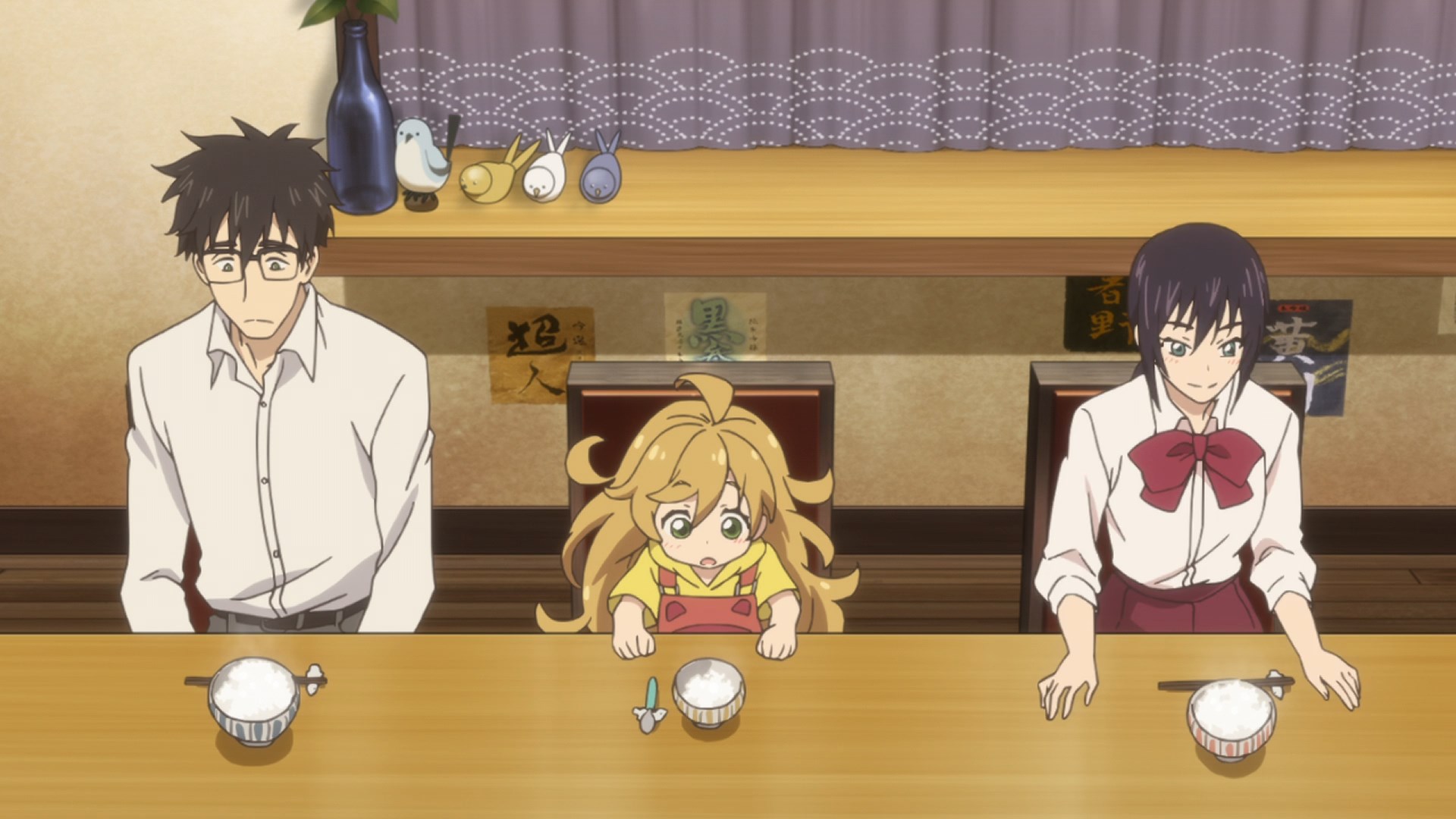 Description: A group of people sitting at a table with cups and bowls on it in a room with a wooden floor.