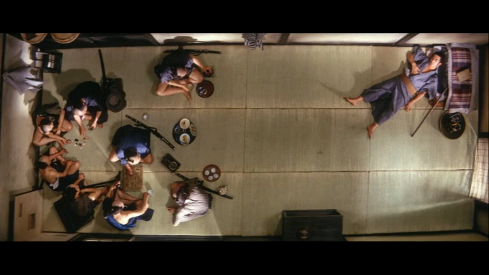 Description: A group of people sitting around a table with food on it and a tv in the background with a man standing in the middle.