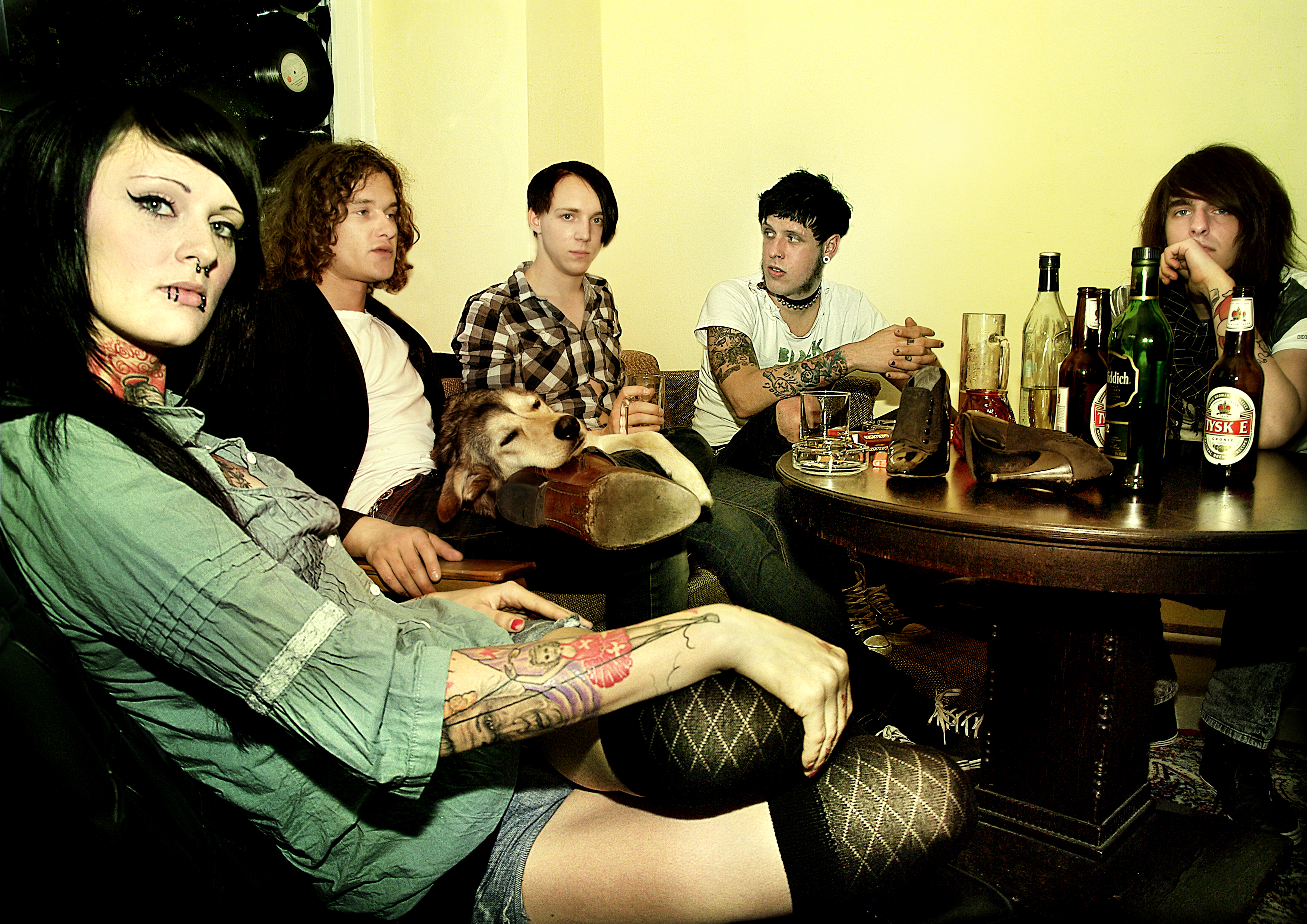Description: A group of people sitting around a table with bottles of wine on it and a dog in the middle.