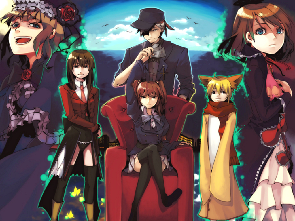 Description: A group of people sitting on top of a red chair in front of a sky background with stars and clouds.