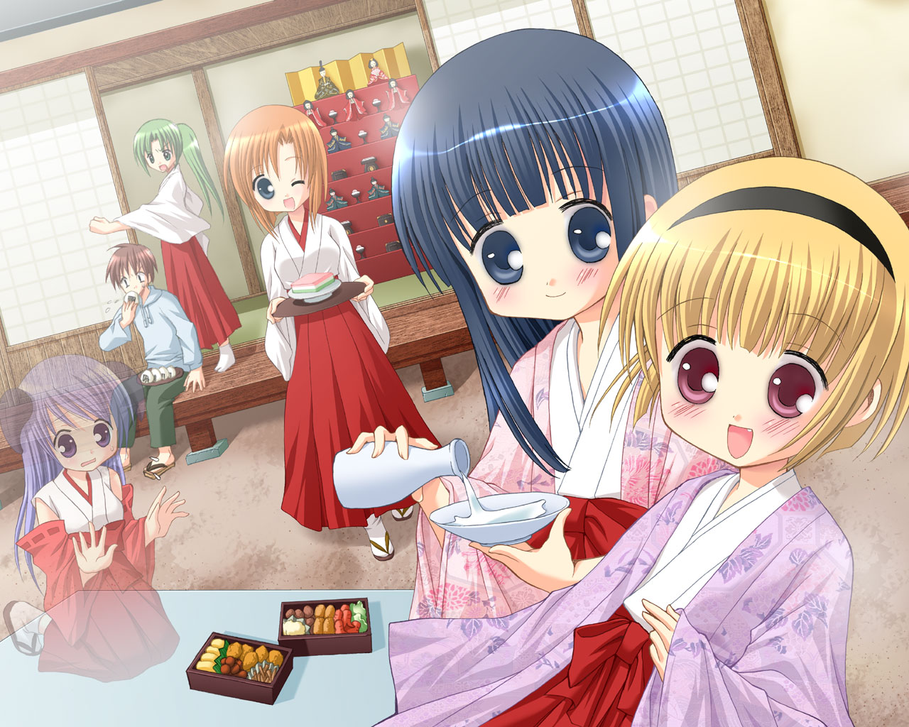 Description: A group of women standing around a table with food on it and a cake on the table in front of them.