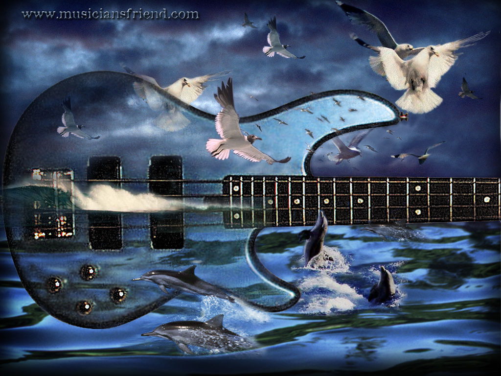 Description: A painting of a guitar with birds flying around it and a body of water with a boat in the background.