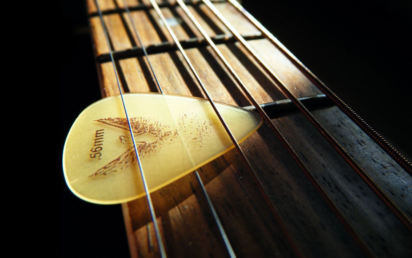 Description: A close up of a guitar's fretstock and fretstocks on a guitar body.