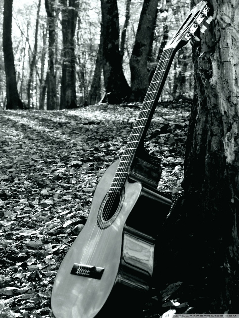 Description: A guitar leaning against a tree in a forest in black and white photo by a photographer in the woods.