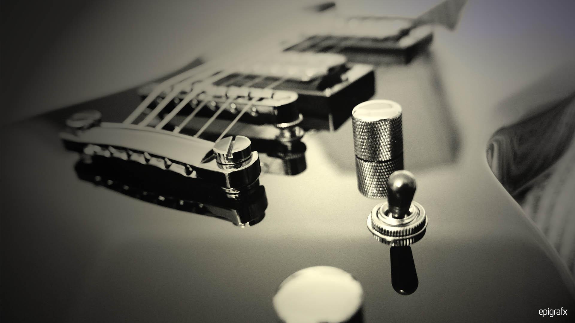 Description: A guitar with a microphone and a guitar picker on a table top with a guitar in the background.
