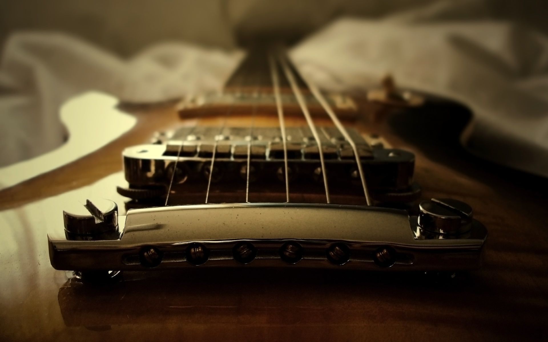 Description: A close up of a guitar neck on a table with a sheet in the background and a guitar in the foreground.